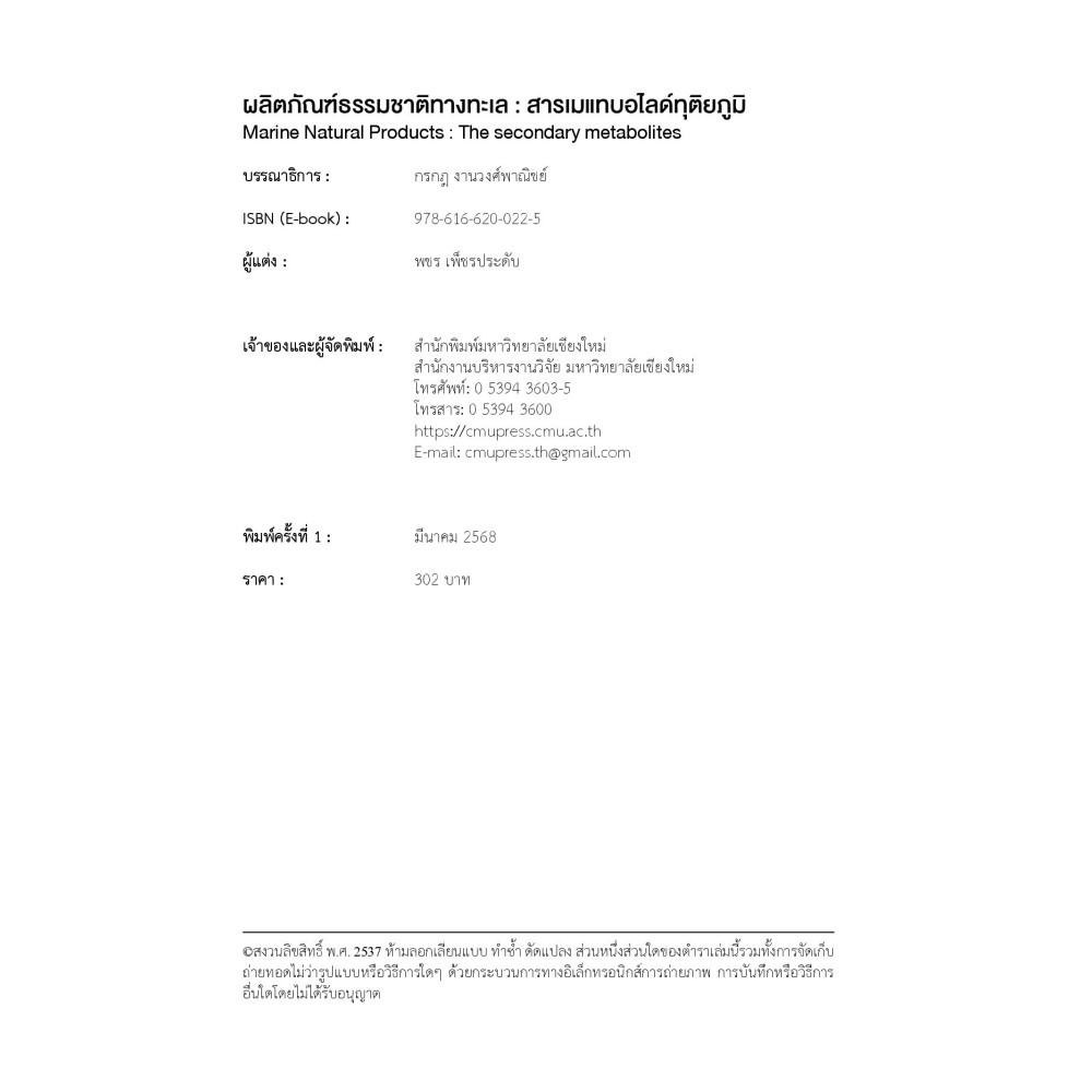หนังสือ "ผลิตภัณฑ์ธรรมชาติทางทะเล : สารเมแทบอไลด์ทุติยภูมิ" โดย พชร เพ็ชรประดับ สาขา วิทยาศาสตร์ทางทะเล มหาวิทยาลัยเทคโนโลยีราชมงคลศรีวิชัย วิทยาเขตตรัง เป็นหนังสือ ที่ให้ความรู้ระดับเบื้องต้นด้านเกี่ยวกับสารมีฤทธิ์ทางชีวภาพที่มีต้นกำเนิดจากสิ่งมีชีวิตในทะเล ตั้งแต่ขั้นพื้นฐานไปสู่การใช้ประโยชน์ มุ่งเน้นให้ผู้อ่านมีมโนทัศน์รวมเกี่ยวกับศาสตร์สาขานี้ ที่ช่วยต่อยอดความคิดสร้างสรรค์ มองเห็นการเชื่อมต่อสัมพันธ์แบบบูรณาการไปสู่ศาสตร์ต่าง ๆ โดยมุ่งเน้นการนำทรัพยากรชีวภาพทางทะเลมาใช้ประโยชน์ระดับอุตสาหกรรมชั้นสูง ซึ่งยังคง ต้องการการส่งเสริมอย่างจริงจัง เป็นหนังสือที่มีความสำคัญและเป็นประโยชน์อย่างยิ่งในการเรียน การสอนระดับปริญญาตรีและบัณฑิตศึกษา นอกจากนั้นยังมีประโยชน์สำหรับผู้สนใจที่ต้องการ เพิ่มพูนความรู้ในด้านนี้