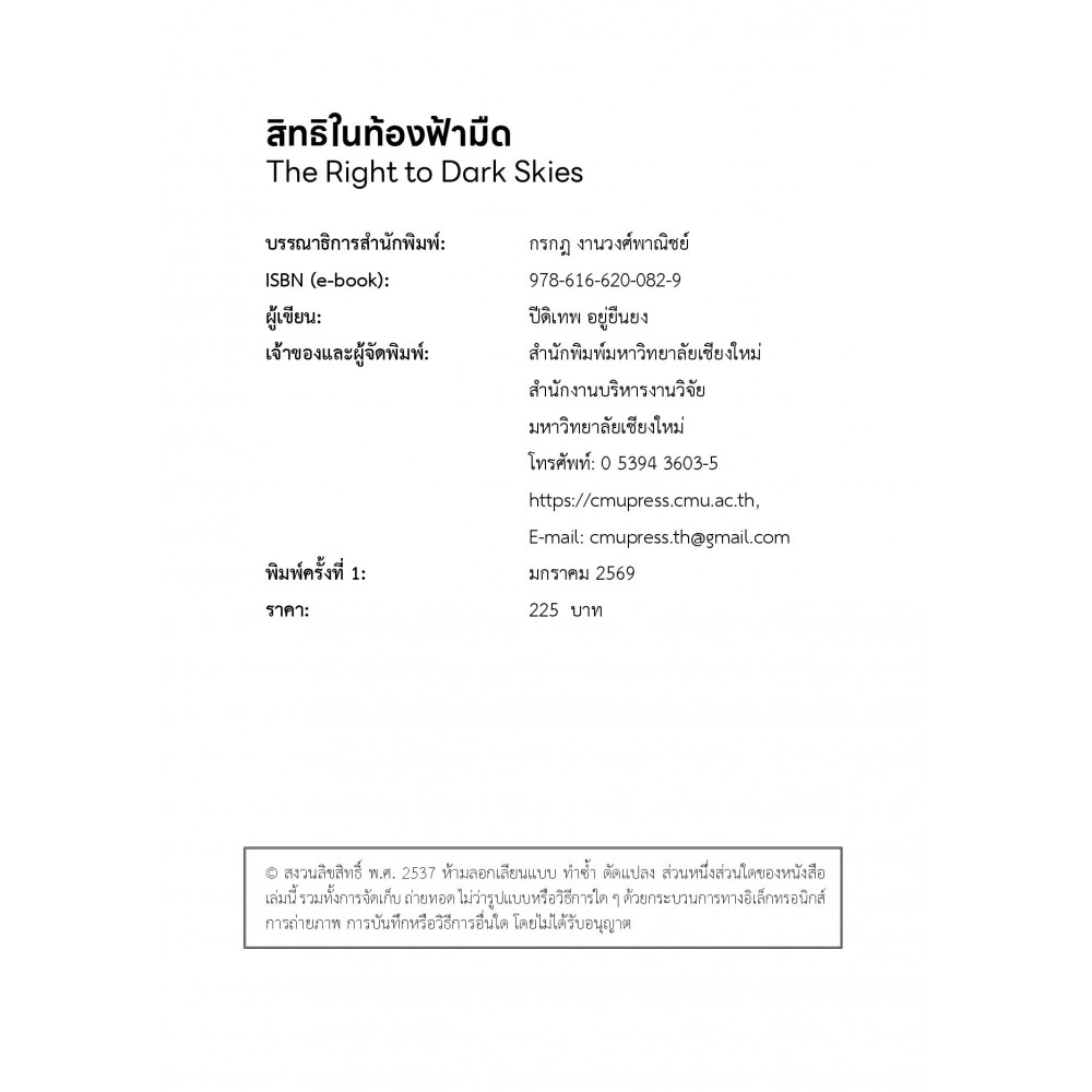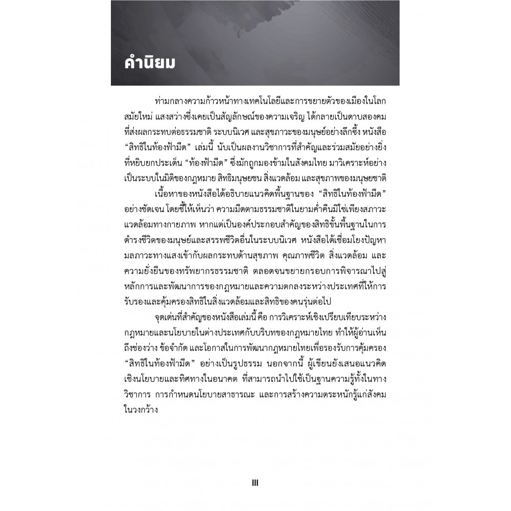 สภาวะที่ท้องฟ้าในยามค่ำคืนถูกรบกวนไปด้วยการติดตั้งใช้งานไฟส่องสว่างภายนอกอาคารที่ ไม่เหมาะสมหรือการออกแบบแสงสว่างที่ไม่เป็นมิตรต่อสิ่งแวดล้อมย่อมส่งผลให้เกิดสภาวะที่ท้องฟ้าในยามค่ำคืนถูกปกคลุมไปด้วยความสว่างไสว ทำให้สิ่งแวดล้อมขาดความมืดตามธรรมชาติในยามค่ำคืน เหตุนี้เองไฟส่องสว่างภายนอกอาคารที่ติดตั้งใช้งานที่ไม่เหมาะสมหรือการออกแบบแสงสว่างที่ไม่เป็นมิตรต่อสิ่งแวดล้อมย่อมก่อให้เกิดมลภาวะทางแสงโดยเฉพาะอย่างยิ่งแสงเรืองไปบนท้องฟ้าซึ่งการใช้งานแสงสว่างภายนอกอาคารจนไปทำลายบรรยากาศความมืดตามธรรมชาติย่อมก่อให้เกิดหรืออาจก่อให้เกิดผลกระทบต่อคุณภาพความมืดตามธรรมชาติที่เป็นประโยชน์ต่อการนอนหลับพักผ่อนของมนุษย์ การใช้ชีวิตของสัตว์ในระบบนิเวศการดูดาวหรือสังเกตปรากฏการณ์ทางธรรมชาติบนท้องฟ้าเหตุนี้เองจึงควรมีการรณรงค์รงค์ส่งเสริมสิทธิในท้องฟ้ามืดให้กลายเป็นสิทธิขั้นพื้นฐานที่พึงจะได้รับการปกป้อง คุ้มครองหรือรับรองไม่ว่าจะเป็นเรื่องสิทธิ เสรีภาพและความเสมอภาคอันเกี่ยวข้องสัมพันธ์กับการดำรงอยู่ของดุลยภาพของธรรมชาติที่สมควรประกอบไปด้วยความสว่างของท้องฟ้าในเวลากลางวันและความมืดของท้องฟ้าในเวลากลางคืน เพื่อประโยชน์ต่อการดำรงชีพของมนุษย์ และการดำรงอยู่ของมนุษยชาติสืบต่อไป หนังสือเล่มนี้มุ่งสร้างความตระหนักรู้ถึง "สิทธิในท้องฟ้ามืด" ที่เป็นสิทธิขั้นพื้นฐานที่พึงจะได้รับในการปกป้องคุ้มครองหรือรับรองภายใต้บทบัญญัติที่ได้กำหนดไว้ตามกฎหมายของหลายประเทศ และมุ่งส่งเสริมให้ผู้อ่านทั่วไปได้เข้าใจถึงบริบทของ "สิทธิในท้องฟ้ามืด"ที่ควรอยู่คู่มนุษยชาติต่อไป