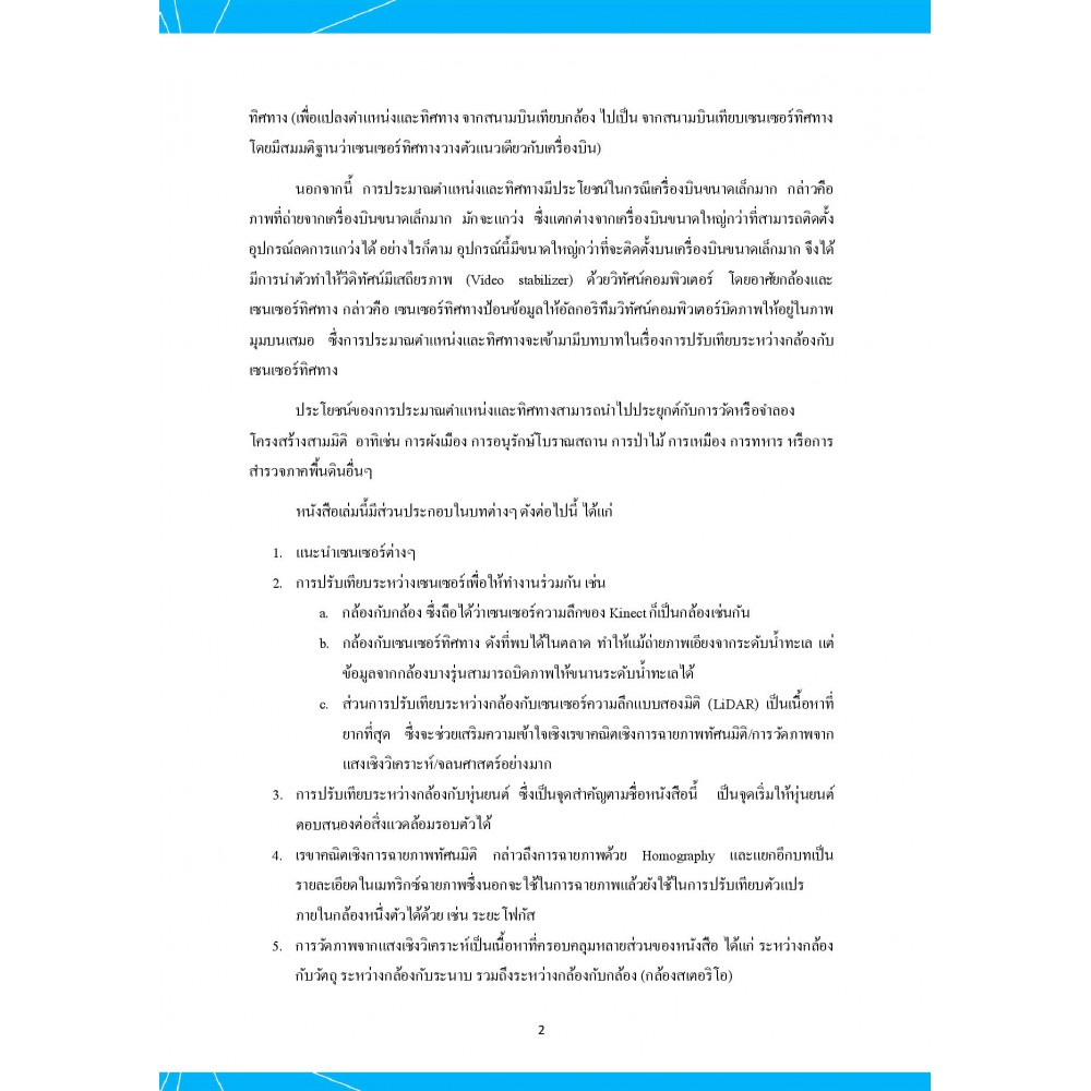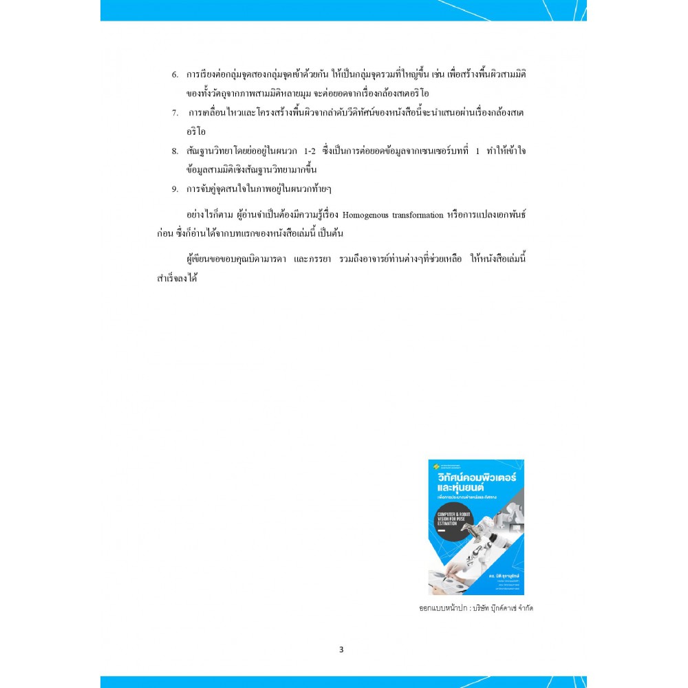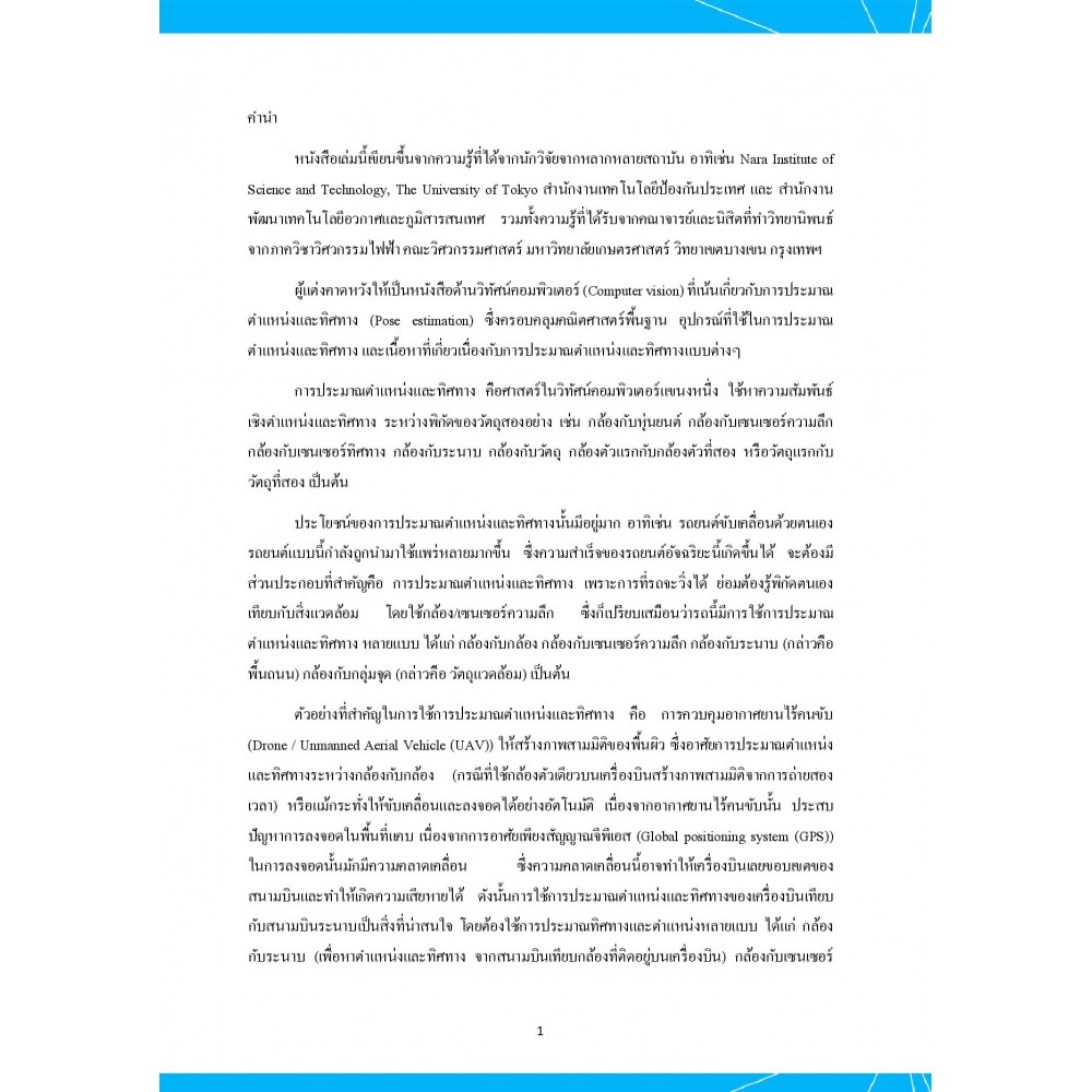 ผู้แต่งคาดหวังให้เป็นหนังสือด้านวิทัศน์คอมพิวเตอร์ (Computervision) ที่เน้นเกี่ยวกับการประมาณ ตําแหน่งและทิศทาง (Pose estimation) ครอบคลุมคณิตศาสตร์พื้นฐาน อุปกรณ์ท่ีใช้ใน นการประมาณ ตําแหน่งและทิศทางและเน้ือหาที่เกี่ยวเนื่องกับการประมาณตําแหน่งและทิศทางแบบต่างๆ การประมาณตําแหน่งและทิศทาง คือศาสตร์ในวิทัศน์คอมพิวเตอร์แขนงหน่ึง ใช้หาความสัมพันธ์ เชิงตําแหน่งและทิศทางระหว่างพิกัดของวัตถุสองอย่างเช่นกล้องกับหุ่นยนต์กล้องกับเซนเซอร์ความลึก กล้องกับเซนเซอร์ทิศทางกล้องกับระนาบกล้องกับวัตถุกล้องตัวแรกกับกล้องตัวที่สองหรือวัตถุแรกกับ วัตถุที่สองเป็นต้น