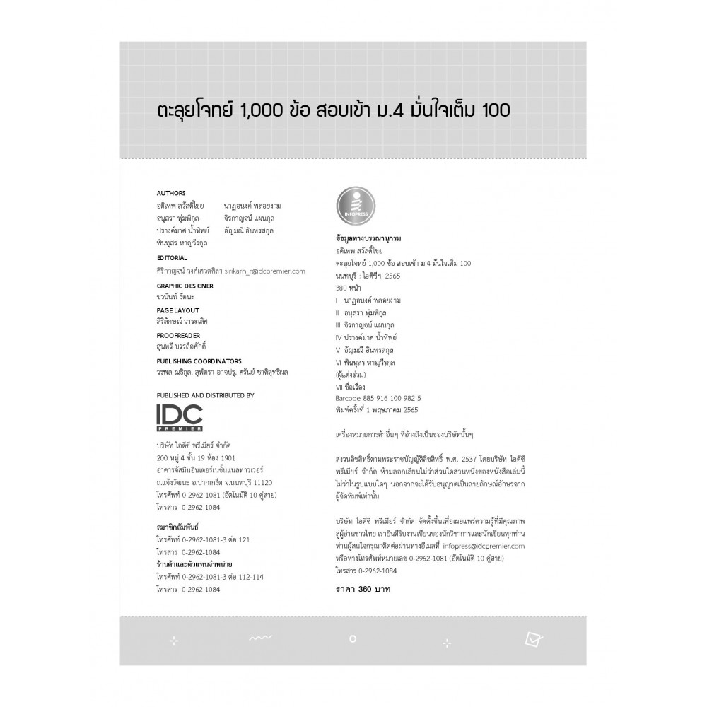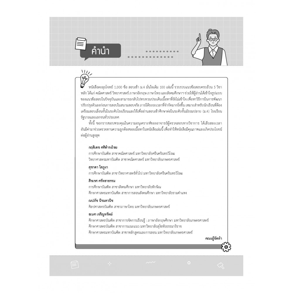 หนังสือ "ตะลุยโจทย์ 1,000 ข้อ สอบเข้า ม.4 มั่นใจเต็ม 100" เล่มนี้ จะทำให้น้อง ๆ เข้าใจจุดประสงค์ที่แท้จริงของการฝึกฝนทำข้อสอบได้มากยิ่งขึ้น ด้วยวิธีการเฉลยของผู้เขียนในแต่ละวิชาที่มีการสอดแทรกจุดเน้น จุดควรจำ และเทคนิคการทำข้อสอบ เพราะการฝึกทำข้อสอบไม่ได้วัดแค่คะแนนมากหรือน้อย แต่การฝึกทำข้อสอบจะวัดความตั้งใจที่เราเรียนมา และเราจะได้เห็นจุดด้อยบางจุดที่เรายังต้องกลับไปพัฒนาให้พร้อมที่จะรับมือกับข้อสอบทั้ง 5 วิชาหลักได้อย่างสมบูรณ์