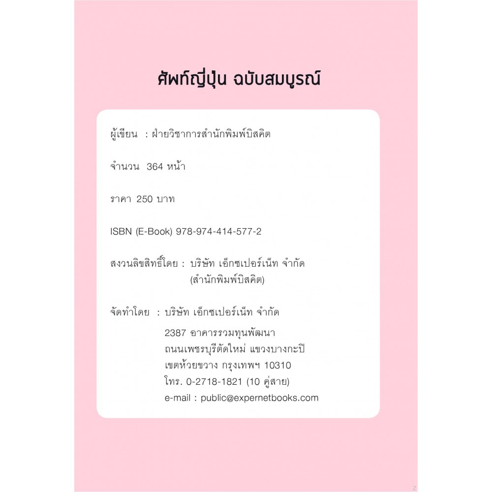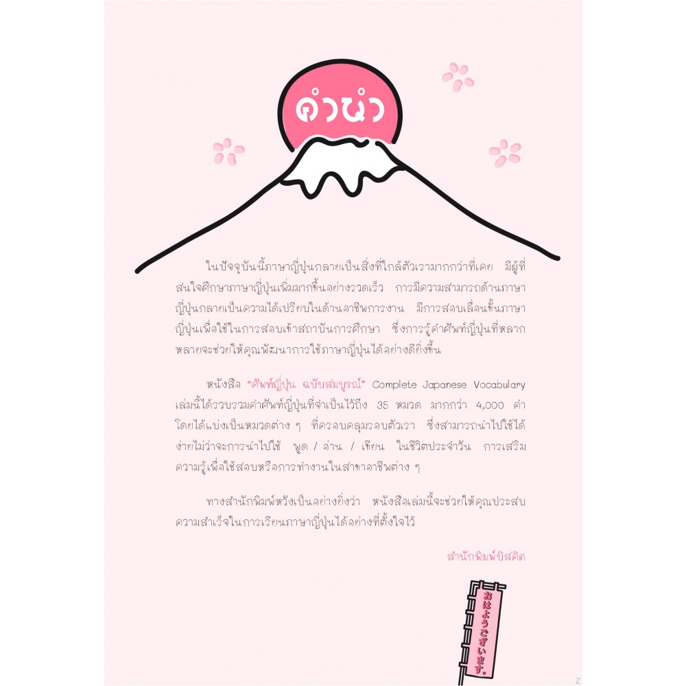 หนังสือ "ศัพท์ญี่ปุ่น ฉบับสมบูรณ์" Completc Japanese Vocabulary เล่มนี้ได้รวบรวมคำศัพท์ญี่ปุ่นที่จำเป็นไว้ถึง 35 หมวด มากกว่า 4,000 คำ โดยได้แบ่งเป็นหมวดต่าง ๆ ที่ครอบคลุมรอบตัวเรา ซึ่งสามารถนำไปใช้ได้ง่ายไม่ว่าจะการนำไปใช้ พูด / อ่าน / เขียน ในชีวิตประจำวัน การเสริมความรู้เพื่อใช้สอบหรือการทำงานในสาขาอาชีพต่าง ๆ "