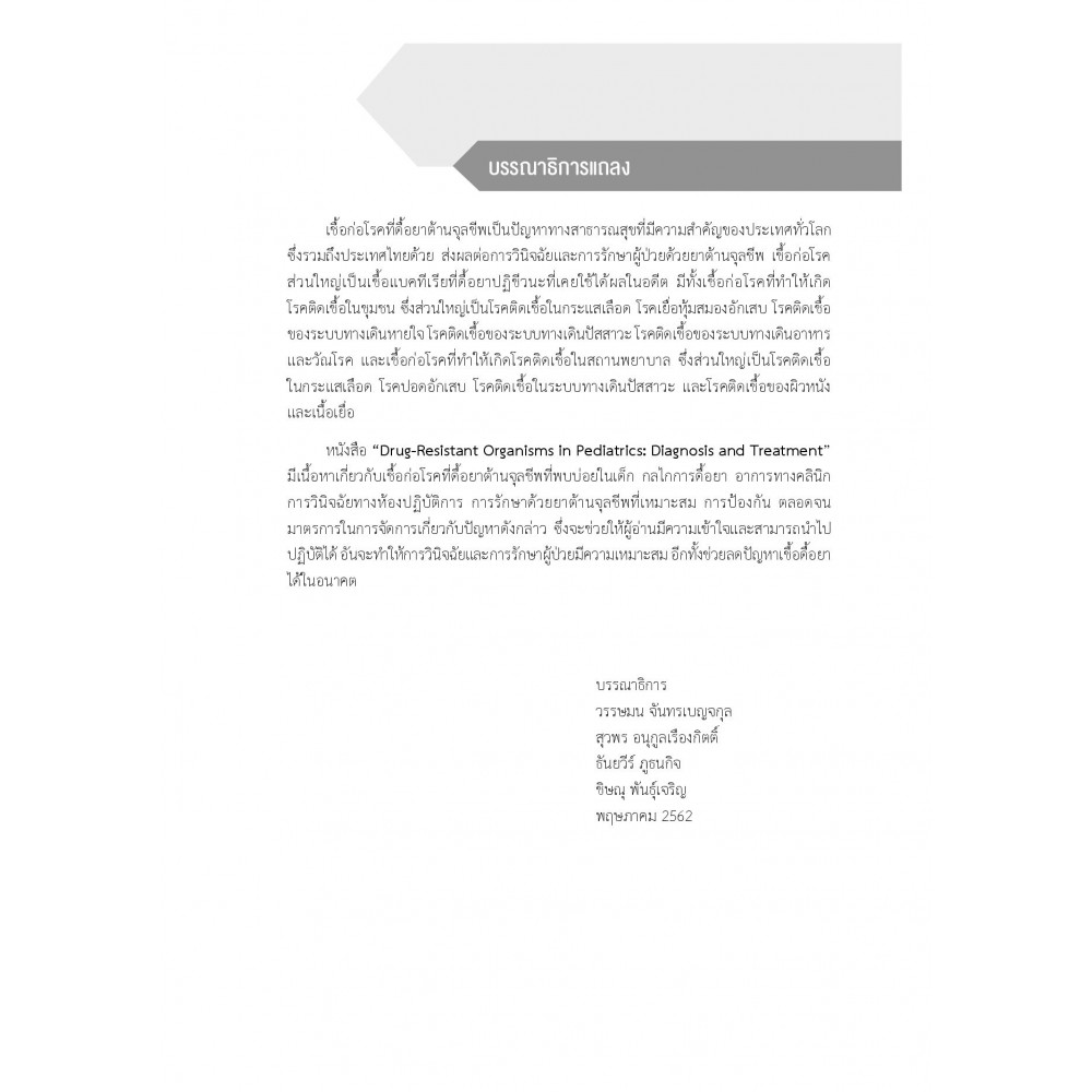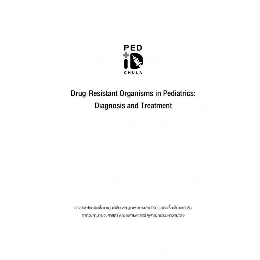 หนังสือ Drug-Resistant Organisms in Pediatrics : Diagnosis and Treatment มีเนื้อหาเกี่ยวกับเชื้อก่อโรคที่ดื้อยาต้านจุลชีพที่พบบ่อยในเด็ก กลไกการดื้อยา อาการทางคลินิก การวินิจฉัยทางห้องปฏิบัติการ การรักษาด้วยยาต้านจุลชีพที่เหมาะสม การป้องกัน ตลอดจนมาตราการในการจัดการเกี่ยวกับปัญหาดังกล่าว ซึ่งจะช่วยให้ผู้อ่านมีความเข้าใจและสามารถนำไปปฏิบัติได้