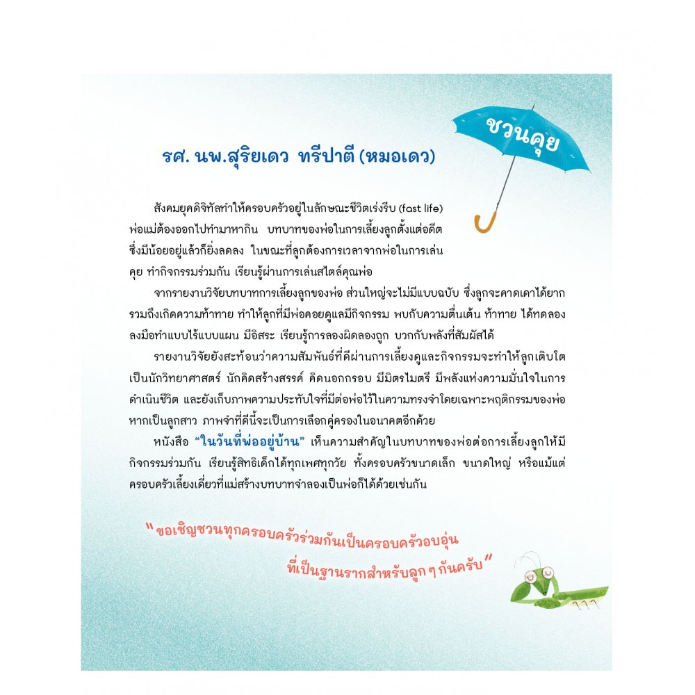 วันนี้เป็นวันหยุดที่พ่อได้อยู่บ้าน แต่ฉันต้องไปโรงเรียนน่ะสิ เอ…ตอนนี้พ่อจะทำอะไรอยู่นะ อยากรีบกลับบ้านไปเล่นกับพ่อเร็ว ๆ จัง แต่ทำไมเวลาถึงผ่านไปช้าอย่างนี้นะ