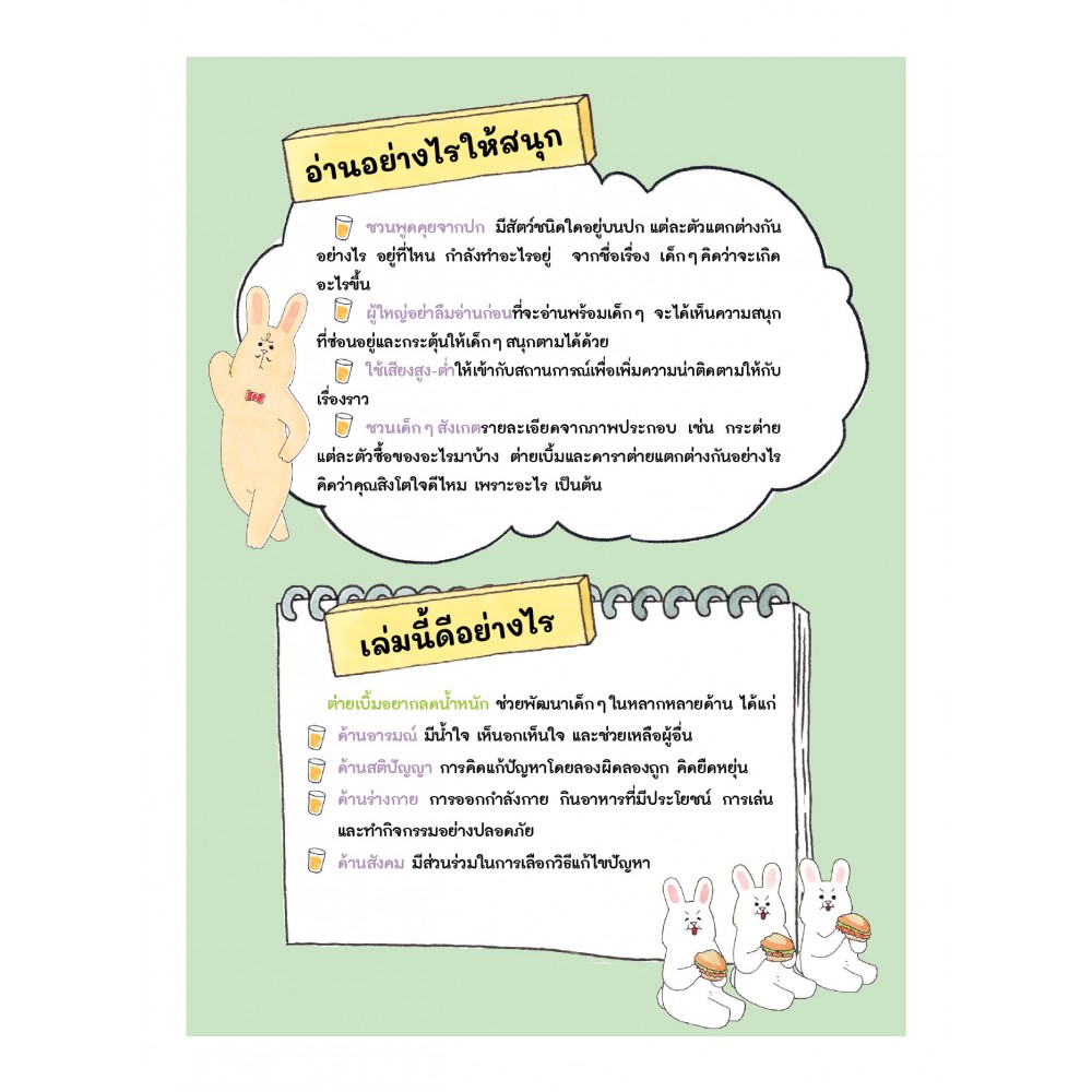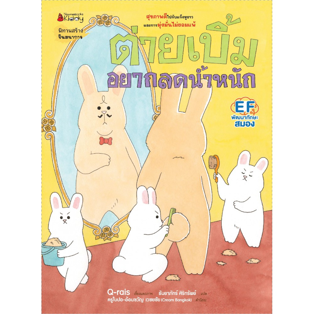 ดาราต่ายหุ่นดีและหล่อมากจริงเชียว ต่ายเบิ้มก็อยากหุ่นดีบ้างจัง... แก๊งหูยาวจึงช่วยคิดวิธีลดน้ำหนักให้หัวหน้าหลายวิธีมาก ต่ายเบิ้มจะลดน้ำหนักได้จริงไหมนะ! มาสนุกและฮาไปกับต่ายเบิ้มและเหล่าลูกสมุนทั้งสามกับนิทานภาพ EF การช่วยเหลือสุดสร้างสรรค์และความมุ่งมั่นไม่ยอมแพ้!