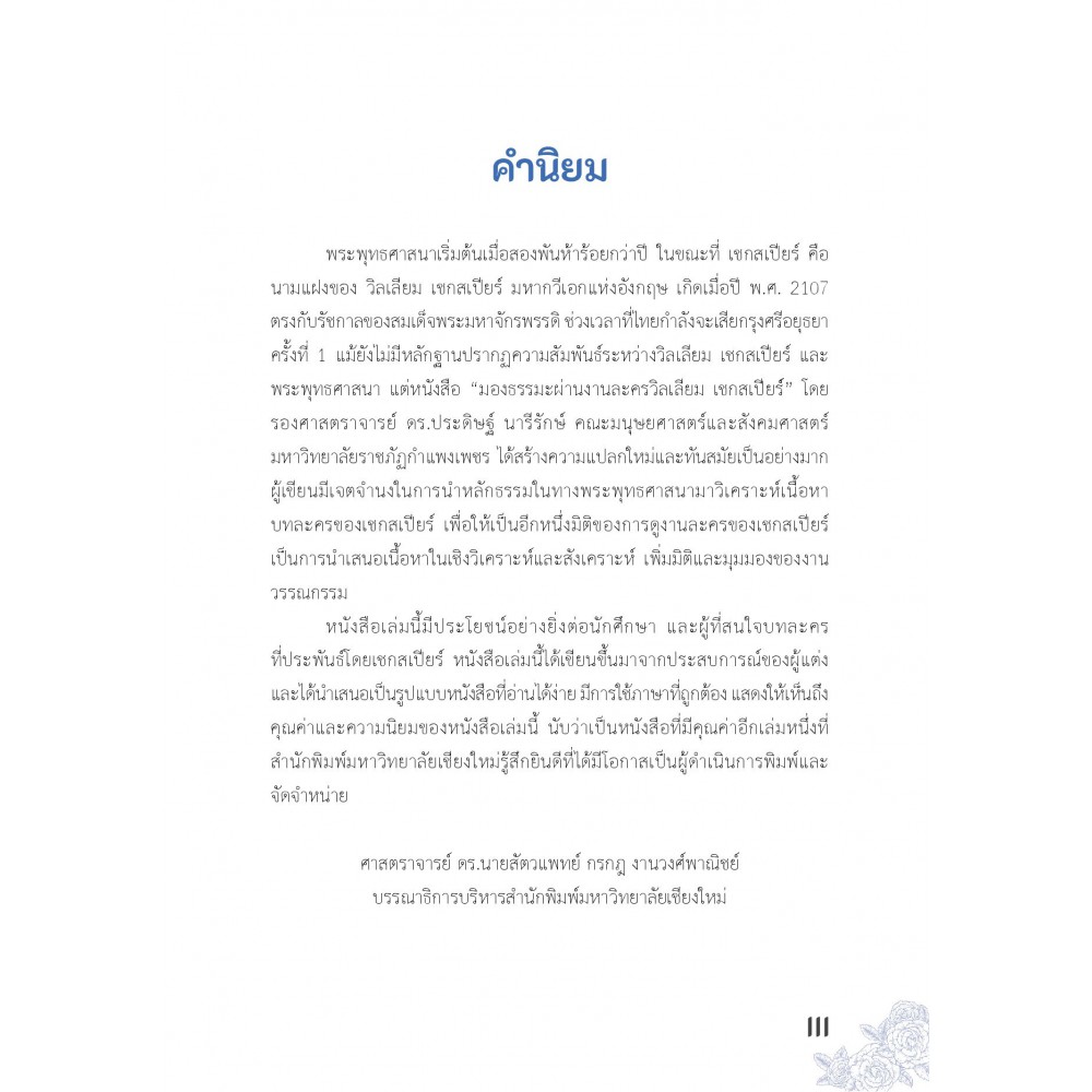 หนังสือเล่มนี้จะทําให้ผู้อ่านได้ดื่มด่ำกับอรรถรส ของบทละครที่ประพันธ์โดยเชกสเปียร์ ในอีกรูปแบบที่แตกต่างออกไป และได้เรียนรู้ หลักธรรมคําสอนในทางพระพุทธศาสนาควบคู่กันไปด้วย โดยผู้อ่านอาจนําไปประยุกต์ ใช้ในชีวิตประจําวัน เฉกเช่นคําภาษิตโบราณที่ว่า "ดูหนังดูละครแล้วย้อนดูตัวเอง" หรือนําคติสอนใจที่ได้ค้นพบจากงานละครนี้ ไปถ่ายทอดให้ผู้อื่นได้ตระหนักรู้
