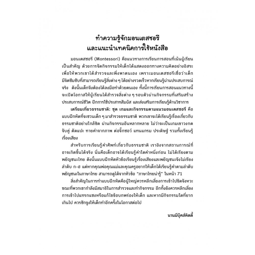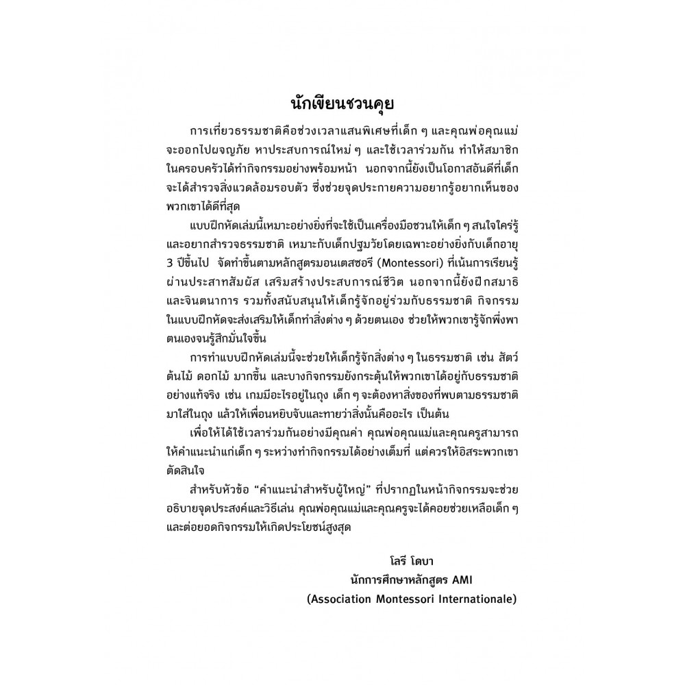 ชุด เกมและกิจกรรมตามแนวมอนเตสซอรี เล่มนี้ออกแบบมาเพื่อส่งเสริมและกระตุ้นให้เด็กอยากเรียนรู้สิ่งแวดล้อมรอบตัว ผ่านเกมแสนสนุกและกิจกรรมตามแนวมอนเตสซอรีสุดท้าทาย ที่จะทำให้เด็กรู้จักพึ่งพา เคารพ และเชื่อมั่นในความสามารถของตนเอง ในเล่มเด็ก ๆ จะได้พบกับกิจกรรมหลากหลาย ทั้งตัดแปะ แทนแกรม จับคู่ ระบายสี นับเลข ฯลฯ เรียนรู้คำศัพท์เกี่ยวกับธรรมชาติและการออกเสียงพยัญชนะ เชิญชวนให้เด็กกล้าออกมาทำกิจกรรมกลางแจ้งเพื่อค้นพบสิ่งใหม่ ๆ นับเป็นแบบฝึกหัดเตรียมความพร้อมหนูน้อยก่อนเข้าโรงเรียน เพื่อพัฒนาศักยภาพจนถึงขีดสุดด้วยธรรมชาติรอบตัว