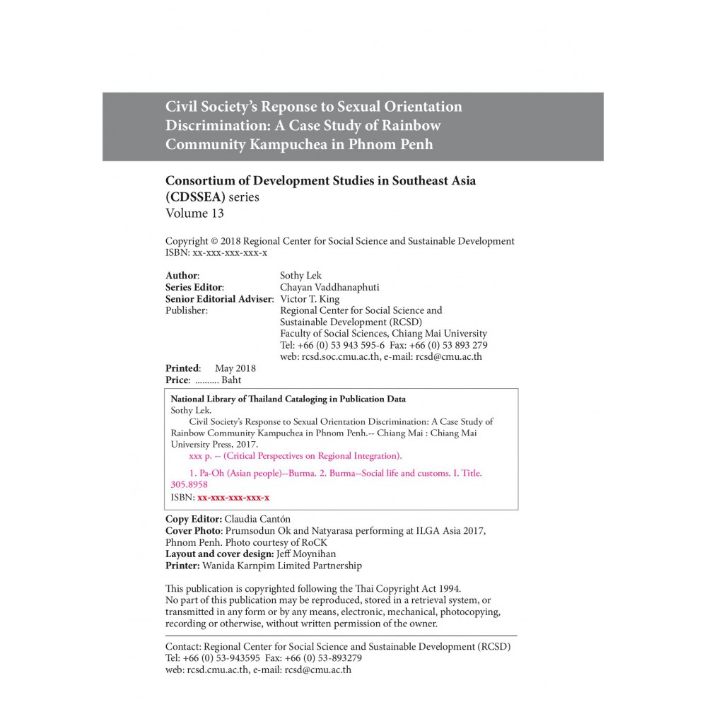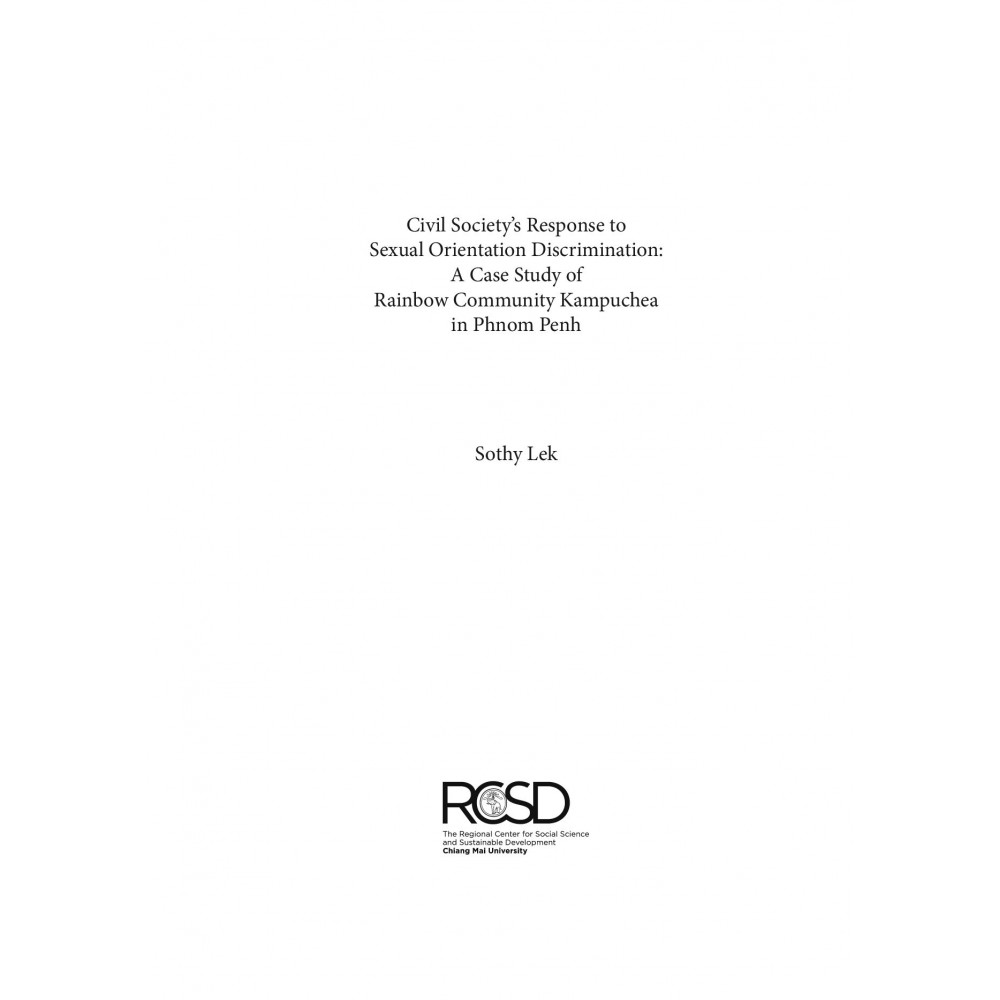 CDSSEA 13 Civil Society’s Response to Sexual Orientation Discrimination A Case Study of Rainbow Community Kampuchea, Phnom Penh Author: Sothy Lek The emergence of the LGBT (lesbian, gay, bisexual and transgender) community has accelerated in recent years, and with it sexuality-based discrimination has emerged as a serious issue in Cambodia. While the number of civil society organizations has increased in recent years, only a few have dealt with LGBT rights. This paper explores the response of civil society organizations to sexual orientation discrimination through the experiences of the Rainbow Community Kampuchea in Phnom Penh. Rainbow Community Kampuchea is a local NGO working exclusively to foster the development of LGBT rights in Cambodia. Highly aware of heterosexism and oppression within the Cambodian context, they have taken diverse actions as tools to respond and cope with sexuality discrimination and make Cambodia a better place for LGBT people. This paper explores how Rainbow Community works to mitigate sexuality discrimination through a series of interviews with both LGBT people and influential members of the Community.