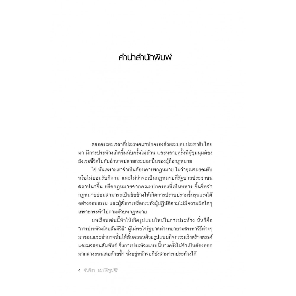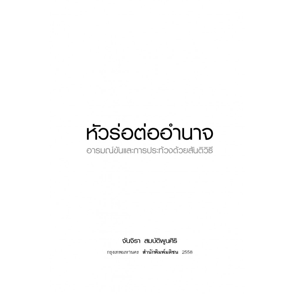 ทำไมเราจึงต้องยอมสยบต่ออำนาจเบ็ดเสร็จที่ริดรอนสิทธิเสรีภาพในทุกด้าน ไม่ว่าจะอยู่ภายใต้ระบอบการปกครองใดๆ และเมื่อเราสูญเสียผลประโยชน์เบื้องต้นเช่นนี้ ก็ควรออกมาเรียกร้อง แต่การประท้วงก็ไม่ควรจบลงด้วยการบาดเจ็บล้มตายเสมอ ถ้ารู้จักใช้สัญลักษณ์และแนวคิดแบบสันติวิธีหนังสือ "หัวร่อต่ออำนาจ : อารมณ์ขันและการประท้วงด้วยสันติวิธี" เล่มนี้ เป็นผลงานของ "จันจิรา สมบัติพูรศิริ" อาจารย์ผู้เชี่ยวชาญเรื่องความสัมพันธ์ต่างประเทศ ได้ทำการเปรียบเทียบรูปแบบการประท้วงด้วยสันติวิธีในโปแลนด์ เซอร์เบีย และไทย (กลุ่มวันอาทิตย์สีแดง) ซึ่งจะทำให้เห็นภาพอีกมุมหนึ่งที่เราไม่เคยคาดคิดว่า พลังจากอารมณ์ขันจะสามารถสั่นคลอดอำนาจรัฐได้หลายรูปแบบ สามารถอ่านเอาสนุก อ่านเอาเกร็ดประวัติศาสตร์ อ่านเพื่อเอาไปปรับปรุงทำตาม หรือเอาไปแตกยอดสร้างสรรค์ เป็นวิธีการประท้วงแบบใหม่ที่สะเทือนใจทุกรัฐบาลได้เป็นอย่างดี