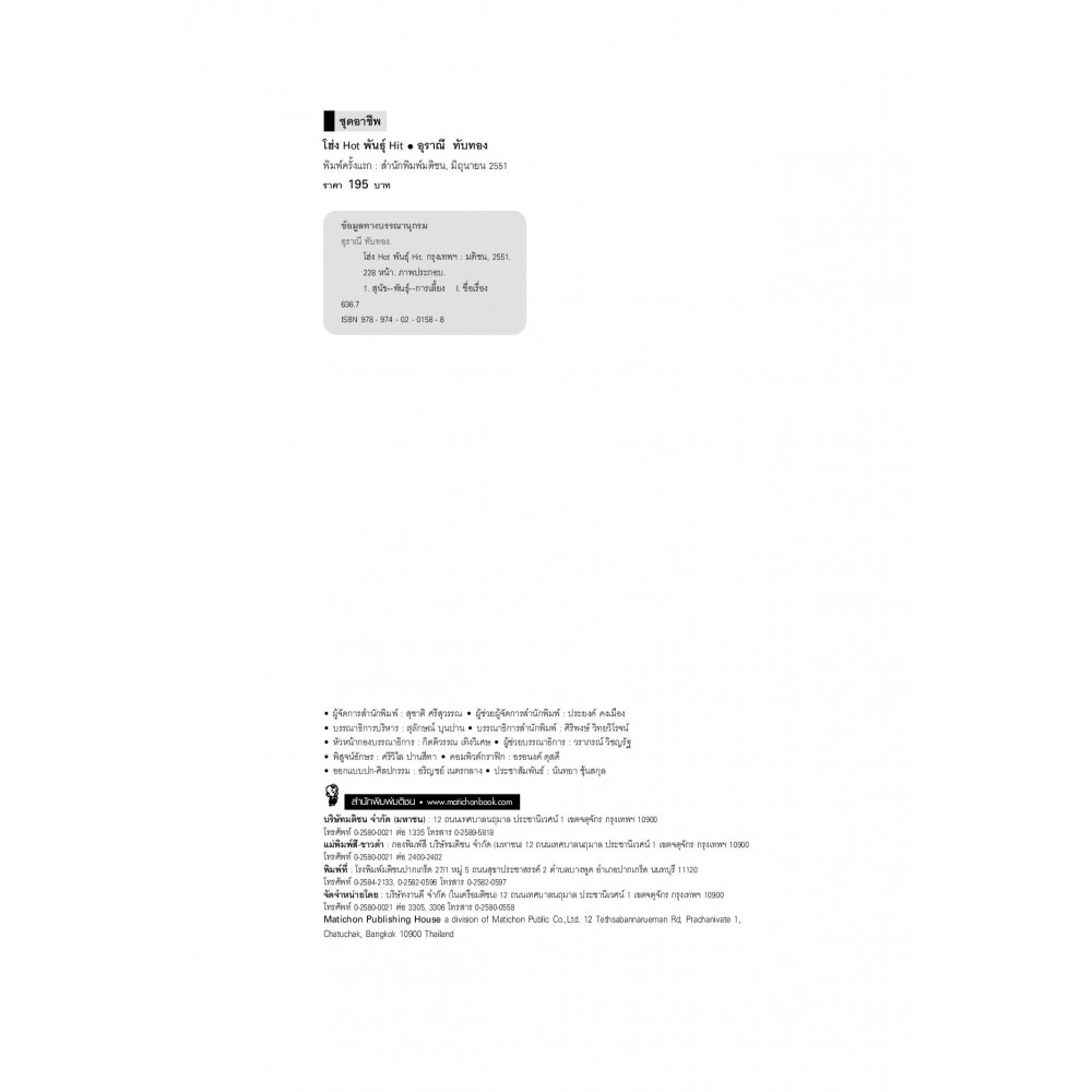 โฮ่ง Hot พันธุ์ Hit รวมสายพันธุ์สุนัขที่โดดเด่น ที่นิยมเลี้ยงและเป็นที่รู้จักกันแพร่หลายในประเทศไทยถึง 20 สายพันธุ์ ตั้งแต่ประวัติความเป็นมา ลักษณะเด่น นิสัยที่แตกต่างกัน รูปร่างและสีขนที่ได้มาตรฐานตามสายพันธุ์ รวมทั้งการเลือกเลี้ยงสุนัขให้เหมาะกับบุคลิกและอุปนิสัยของแต่ละคน ตลอดจนวิธีการ "บรีด" หรือขยายพันธุ์สุนัขจากบรีดเดอร์ผู้เชี่ยวชาญและมีความรักสุนัขเป็นที่ตั้ง สารบัญ - "ปอมเมอเรเนียน" โฮ่ง ฮิต ติดตลาด - สุนัขไอคิวสูง "บอร์เดอร์ คอลลี่" ฉลาดที่สุดในโลก - ยักษ์ใหญ่ใจดี "ดซนต์เบอร์นาร์ด - มินิหมา "ชิวาวา ไซซ์จิ๋ว" - "ชิห์สุ" มาตรฐานน้องหมายอดรัก - มะหมาไฮโซ "พูเดิล สแตนดาร์ด" - จอมพลังพันธุ์ดื้อ "บูลเทอร์เรีย" - อีกมุมหนึ่งของ "บูลเทอร์เรียร์ - น้องหมาหน้าหวาน "คาวาเลียร์ คิง ชาร์ลส์ สแปเนียล" - "ลาบราดอร์" สุดหล่อโฮ่งฮับ ฯลฯ สุนัข-พันธุ์-การเลี้ยงอาชีพ