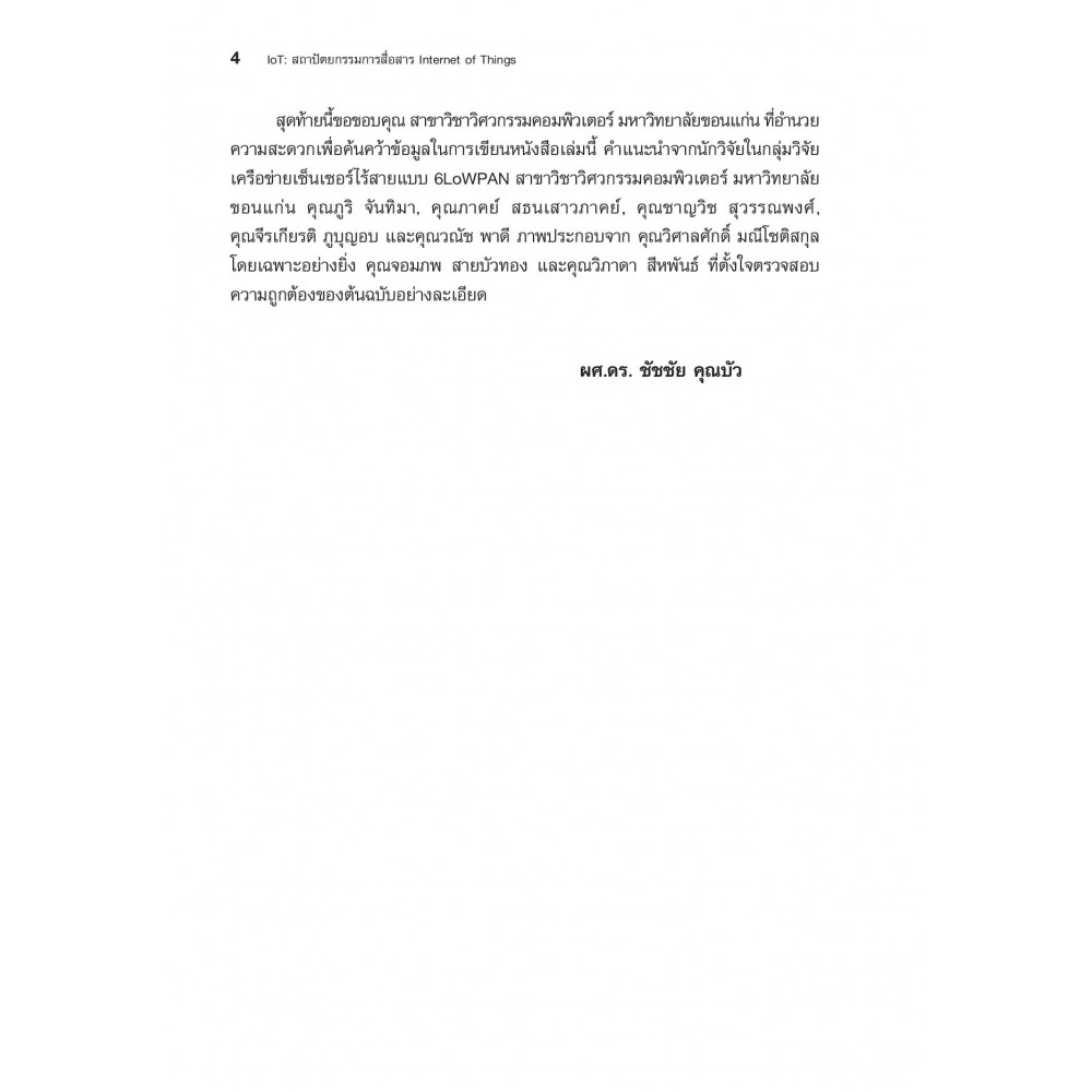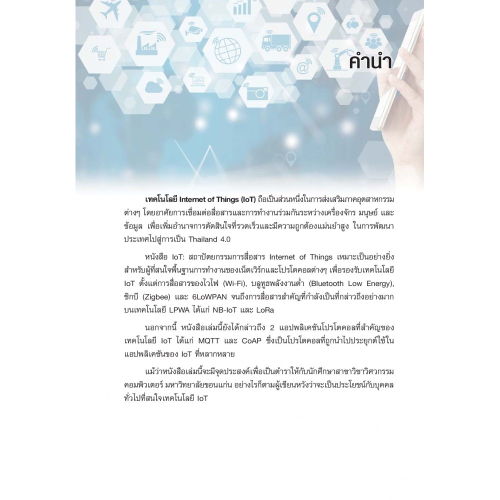 ผู้อ่านเข้าสู่โลกของการสื่อสารบนเทคโนโลยี Internet of Things (IoT) เพื่อให้ผู้อ่านสามารถเข้าใจถึงเทคโนโลยีต่างๆ ตั้งแต่การสื่อสารระยะสั้น ได้แก่ ไวไฟ (Wi-Fi) บลูทูธพลังงานต่ำ (Bluetooth) ซิกบี (Zigbee) และเครือข่ายไร้สายส่วนบุคคลบน IPv6 (6LowPAN) รวมไปถึงการสื่อสารระยะไกล โดยใช้เทคโนโลยี Low Power Wide Area (LPWA) ได้แก่ NB-IoT และ LoRa นอกจากนี้ยังได้กล่าวถึงแอปพลิเคชันที่ใช้ทำงานบนเทคโนโลยี IoT อย่างแพร่หลาย ทั้งนี้ยังได้นำผู้อ่านไปสู่โลกเทคโนโลยี 5G ในอนาคต เพื่อให้ทันต่อการเปลี่ยนแปลงของเทคโนโลยีการสื่อสารที่จะเกิดขึ้น
