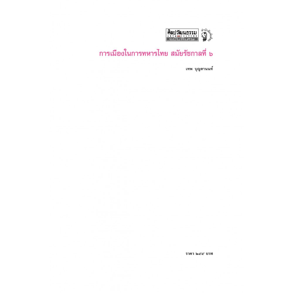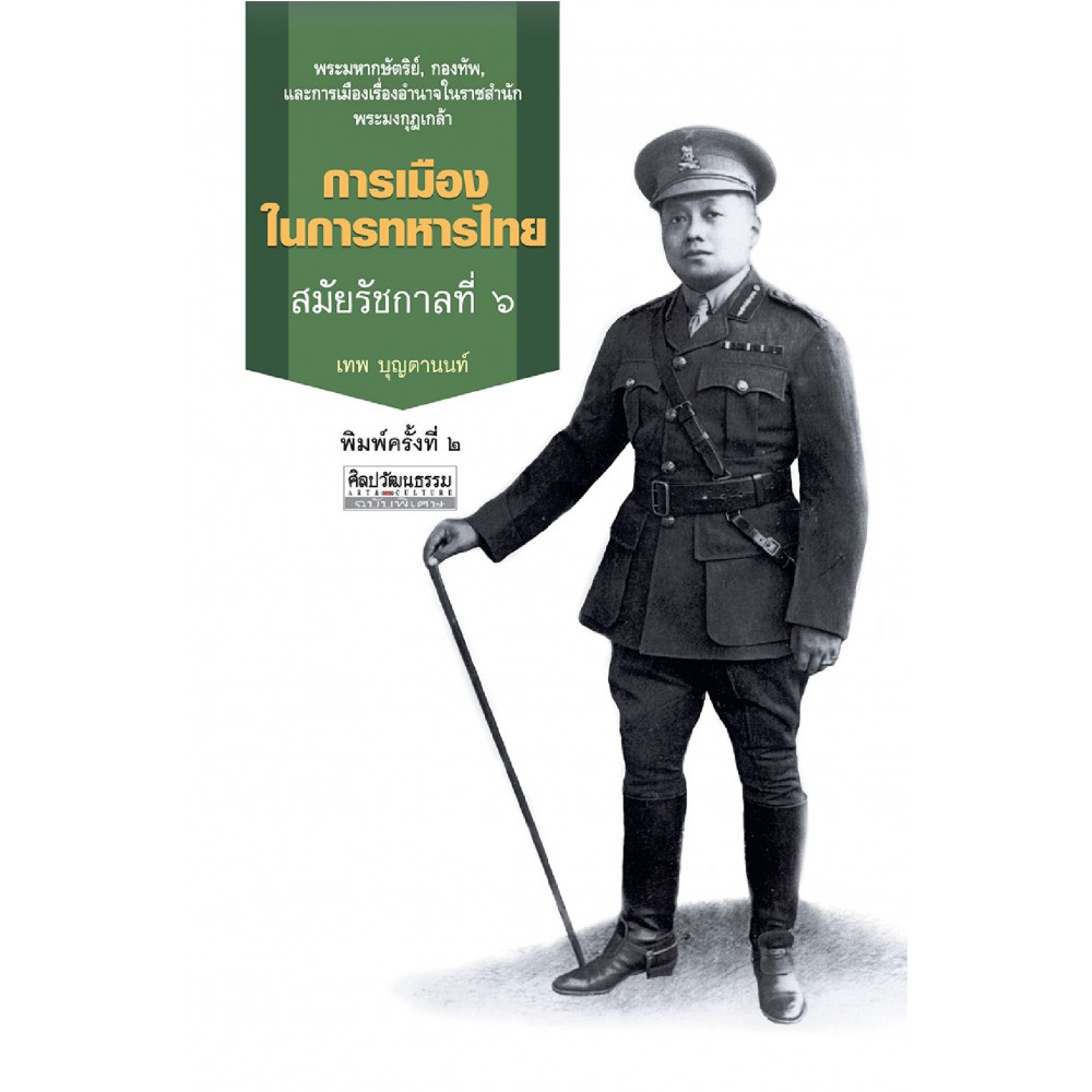 การเมืองในการทหารไทย สมัยรัชกาลที่ 6 พระมหากษัตริย์ กองทัพ และการเมืองเรื่องอำนาจในราชสำนักพระมงกุฎเกล้า ผู้เขียน เทพ บุญตานนท์ เมื่อครั้ง "พระบาทสมเด็จพระมงกุฎเกล้าเจ้าอยู่หัว" ทรงดำรงตำแหน่งเป็น "สยามมกุฏราชกุมาร" พระองค์มิได้มีตำแหน่งทางการทหารที่สำคัญ อีกทั้งยังมิได้ทรงพระศึกษาเล่าเรียนด้านการทหารมาโดยตรง ต่อมาเมื่อพระองค์ทรงครองราชสมบัติ อันเป็นยุคสมัยที่ประเทศทั่วโลกต่างมีกษัตริย์ที่เป็น "นักรบ" มีความสามารถปรีชาด้านการศึกสงคราม และเป็นยุคสมัยที่เหล่าชายชาติทหารต้องการ "ผู้นำ" ที่เป็น "ทหาร" พระองค์จึงจำเป็นต้องปรับพระองค์เพื่อเสริมสร้างภาพ "การทหาร" และทรงกระทำทุกวิถีทางเพื่อนำทหารมาอยู่ฝ่ายพระองค์ การแต่งตั้งโยกย้ายคนสนิท การเสริมสร้างกำลังกองทัพส่วนพระองค์ อาทิ เสือป่า กรมทหารรักษาวัง ล้วนแล้วแต่เป็นกุศโลบายที่พระองค์พยายามดึงอำนาจกองทัพมาทั้งสิ้น แต่ไม่หนทางไม่ง่ายเช่นนั้น เพราะ "พระราชอำนาจ" ทางการทหารทั้งหมดกลับไปตกอยู่ในพระเชษฐาและพระอนุชาในพระองค์... สารบัญ 1. พระบาทสมเด็จพระมงกุฎเกล้าเจ้าอยู่หัวกับกองทัพ 2. กองทัพส่วนพระองค์ 3. การพัฒนากองทัพเพื่อสร้างภาพลักษณ์ทางการทหาร 4. สงครามโลกครั้งที่ 1 กับการสร้างภาพลักษณ์ทางการทหาร 5. งานพระราชนิพนธ์กับการสร้างภาพลักษณ์ทางการทหาร 6. กองทัพกับวาทกรรม "ชาติ ศาสน์ กษัตริย์"
