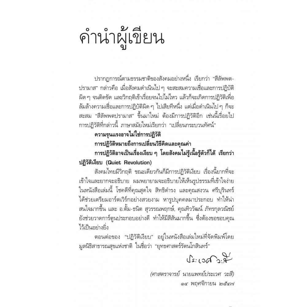 การปฏิวัติด้วยสันติวิธี อาจให้ผลช้า แต่ประเทศไทยเป็นประเทศสันติภาพ จึงเอื้ออำนวยให้การทำปฏิวัติเงียบ อ่านปฏิวัติเงียบเนื้อหาเข้มข้นภายในเล่มนี้เล่มเดียว ที่ไม่ควรพลาด