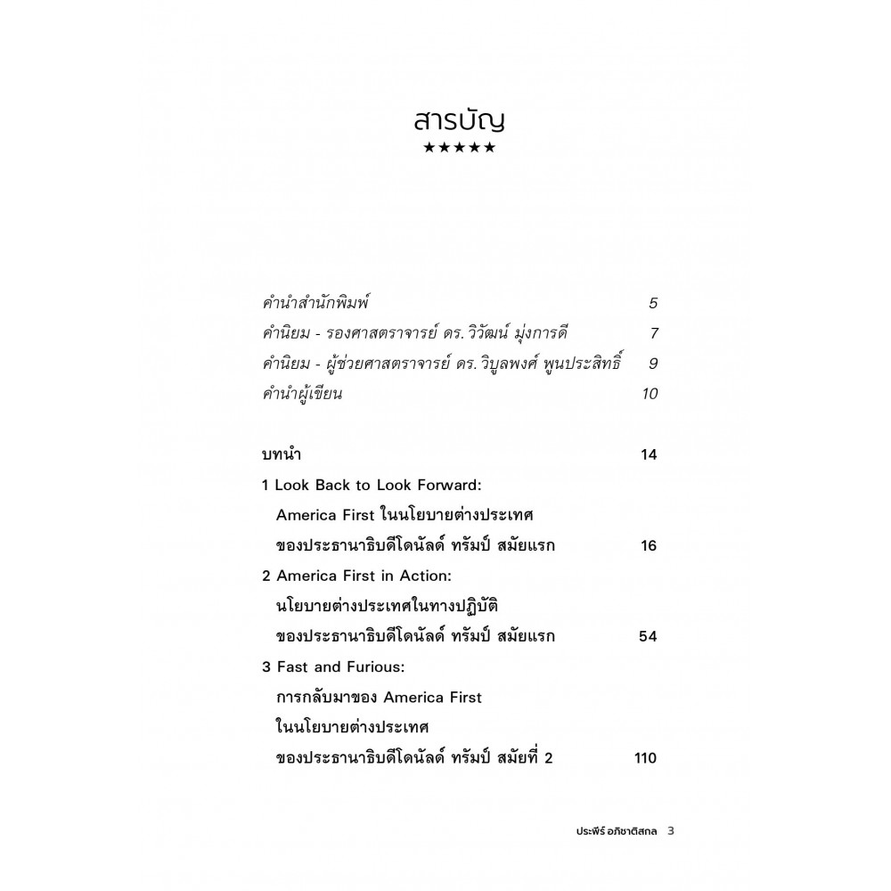 พานักอ่านสำรวจแนวคิด “อเมริกาต้องมาก่อน” ที่มีประวัติศาสตร์ความเป็นมาตั้งแต่ก่อนสงครามโลก เพื่อดูว่าเหตุใดแนวคิดเก่าแก่เช่นนี้จึงกลับมา และภายใต้กรอบแนวคิดนี้นโยบายต่างประเทศของรัฐบาลทรัมป์สมัยแรกปฏิบัติต่อจีน รัสเซีย ตะวันออกกลาง และประชาคมโลกอย่างไร รวมทั้งเปรียบเทียบและแกะแนวคิดช่วงแรกของรัฐบาลทรัมป์สมัยที่ 2 ซึ่งดำเนินนโยบายต่างประเทศแบบสั่นสะเทือนโลก