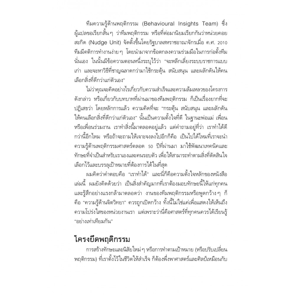 "พวกเราทุกคน ตั้งแต่นายกรัฐมนตรี คนที่เป็นพ่อแม่ ไปจนถึงข้าราชการ บ่อยครั้งต่างตกอยู่ในสถานการณ์ที่ต้องช่วยคนอื่นทำบางสิ่งให้สำเร็จ ซึ่ง คนคนนั้นอาจเป็นเพื่อนเรา เพื่อนร่วมงาน ลูกของเรา ลูกค้า หรือบางครั้งก็ คือตัวเราเอง สิ่งที่น่าอัศจรรย์และชวนฉงนอย่างหนึ่งของความเป็นมนุษย์คือ เรามัก ไม่เข้าใจตัวเอง เราตั้งใจแน่วแน่ว่าจะดูแลตัวเองให้ดีขึ้น จะไม่โมโหรำคาญ คนที่เรารัก และจะทำตามเป้าหมายที่ตั้งไว้ให้สำเร็จ แต่โลกนี้เต็มไปด้วยสิ่ง ดึงดูดใจ ซึ่งล่อใจชวนให้เราไขว้เขว ทั้งยังมีความกดดันต่าง ๆ มากมาย ยิ่งไป กว่านั้น สมองและชีวิตของเราเองยังเต็มไปด้วยนิสัยเก่า ๆ เหมือนรอยทางเดิน เดิม ๆ ที่เดินมาจนชิน ทันทีที่ใจเราเผลอว่อกแว่กไป ซึ่งเป็นสิ่งที่ย่อมเกิดขึ้น อย่างเลี่ยงไม่ได้ เราก็พบว่า ตัวเองกลับไปยังเส้นทางเดิมที่ตั้งใจจะเดินออกมา ส่วนเป้าหมายใหม่ที่ตั้งไว้ก็ห่างไกลออกไปเรื่อย ๆ ทีมความรู้ด้านพฤติกรรม (Behavioural Insights Team) ซึ่ง ผู้แปลขอเรียกสั้น ๆ ว่าทีมพฤติกรรม หรือที่ต่อมานิยมเรียกกันว่าหน่วยคอย สะกิด (Nudge Unit) จัดตั้งขึ้นโดยรัฐบาลสหราชอาณาจักรเมื่อ ค.ศ. 2010 ทีมมีคติการทำงานง่าย ๆ โดยนำมาจากข้อตกลงความร่วมมือในการก่อตั้งทีม นั่นเอง ในนั้นมีข้อความตอนหนึ่งระบุไว้ว่า “จะหลีกเลี่ยงระบบราชการแบบ เก่า และจะหาวิธีที่ชาญฉลาดกว่ามาใช้กระตุ้น สนับสนุน และผลักดันให้คน เลือกสิ่งที่ดีกว่าแก่ตัวเอง”"