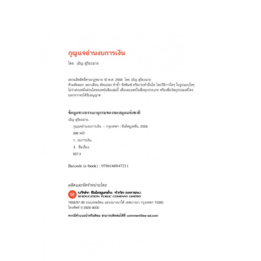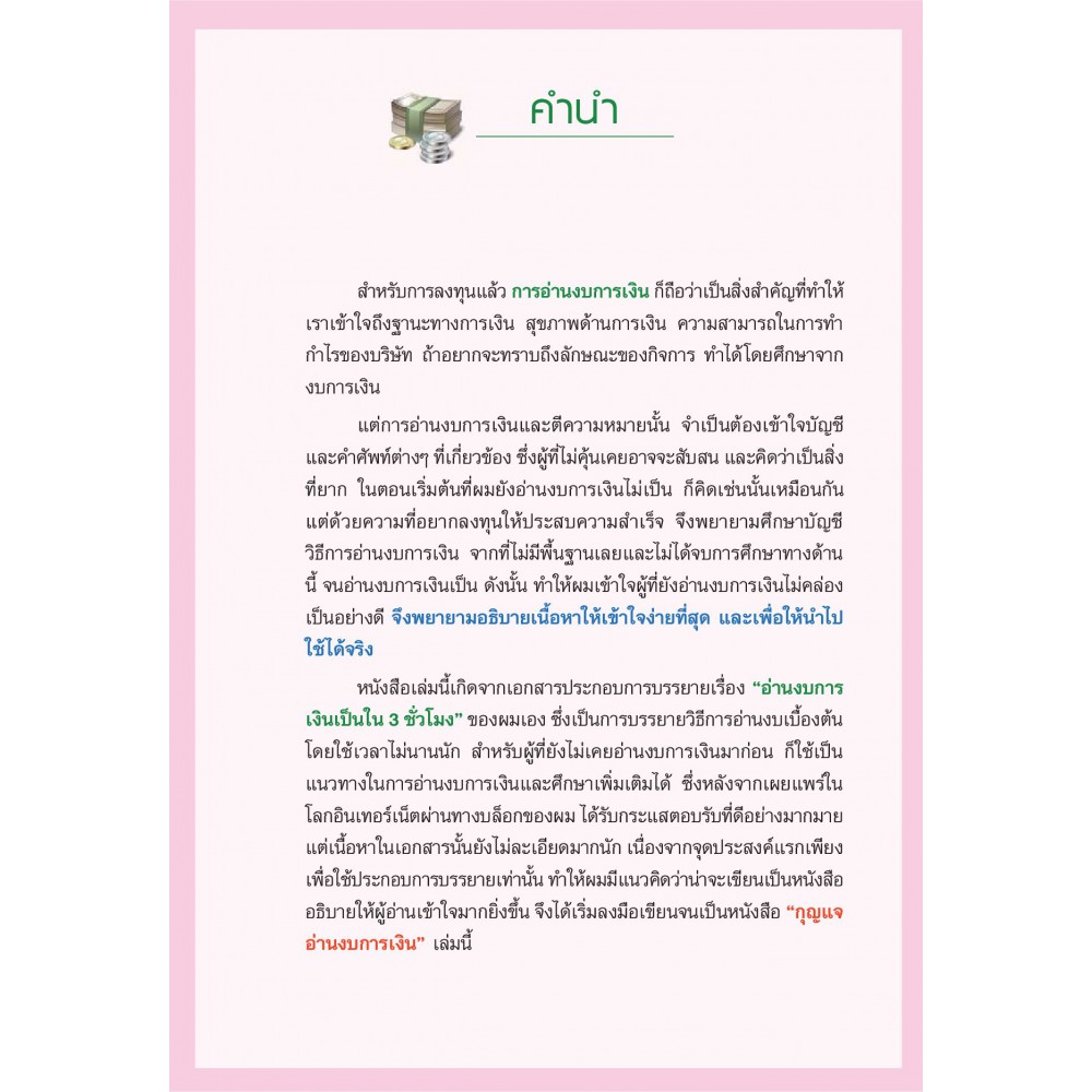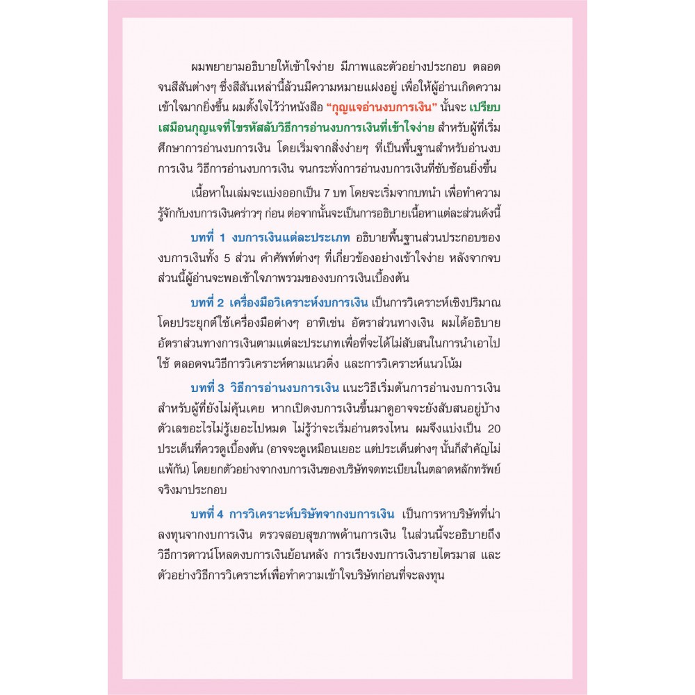"กุญแจอ่านงบการเงิน" เปรียบเสมือนกุญแจที่ไขรหัสลับวิธีการอ่านงบการเงินที่เข้าใจง่าย เหมาะสำหรับผู้ที่เริ่มต้นศึกษาการอ่านงบการเงิน โดยเริ่มจากสิ่งง่ายๆ ที่เป็นพื้นฐานสำหรับอ่านงบการเงิน จับจุดวิธีการอ่านงบการเงินทีละขั้นตอน จนกระทั่งสามารถอ่านงบการเงินที่ชับซ้อนยิ่งขึ้นได้ โดยอธิบายให้เข้าใจง่าย มีภาพและตัวอย่างประกอบ ตลอดจนสีสันต่างๆ ซึ่งสีสันเหล่านี้ล้วนมีความหมายแฝงอยู่ เพื่อให้ผู้อ่านเกิดความเข้าใจมากยิ่งขึ้น ถ้าอยากเป็นนักลงทุนที่ประสบความสำเร็จ ยังไงแล้วก็ ต้องอ่านงบการเงินให้เป็น!"