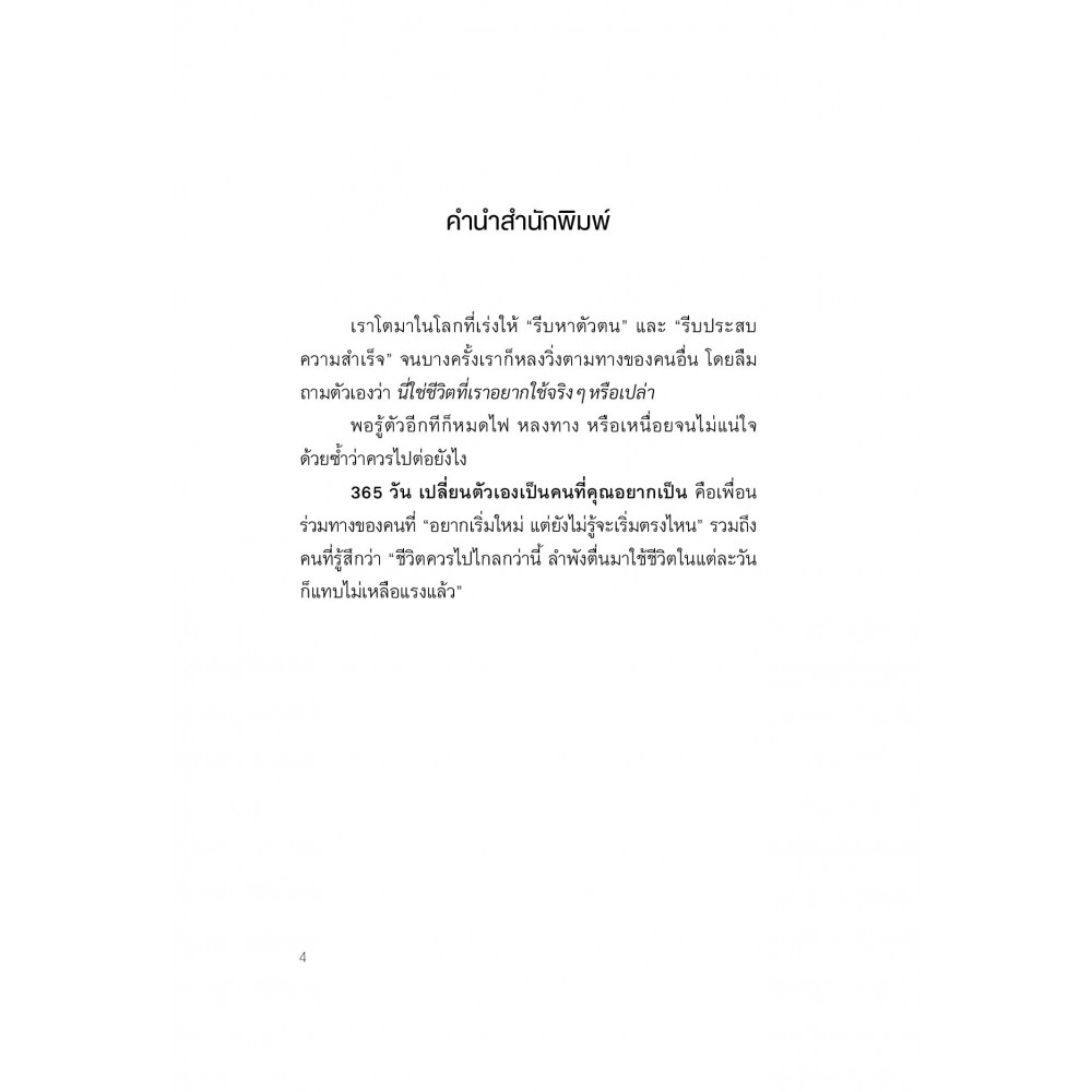 365 วัน เปลี่ยนตัวเองเป็นคนที่คุณอยากเป็น เล่มนี้คือหนังสือซึ่งรวบรวมบทสะท้อนความคิด 365 บท สำหรับอ่านวันละบทตลอด 1 ปี โดยเนื้อหามุ่งเน้นการเปลี่ยนแปลงภายในตนเองผ่านการตั้งคำถาม ปรับมุมมอง และเลือกสิ่งเล็ก ๆ น้อย ๆ ในแต่ละวันอย่างตั้งใจ หนังสือเล่มนี้ชวนให้คุณกล้ากลับมาเป็นตัวของตัวเองโดยไม่ลดทอนคุณค่าเพื่อต้องเข้ากับใคร ช่วยให้เผชิญหน้ากับความกลัว เข้าใจความไม่แน่นอน และเรียนรู้การปล่อยสิ่งที่ไม่ใช่เพื่อเปิดทางให้สิ่งที่ใช่เข้ามาในชีวิต เนื้อหาแต่ละบทชี้แนะให้ตั้งเป้าหมายจากภายใน ไม่ใช่เพื่อการประสบความสำเร็จเพียงอย่างเดียว แต่เพื่อการมีชีวิตที่เต็มเปี่ยมไปด้วยสิ่งที่คุณต้องการอย่างแท้จริง รวมถึงการกลับมาดูแลจิตใจ สร้างความสัมพันธ์ที่ดีทั้งกับตัวเองและผู้อื่น โดยไม่ละทิ้งตัวตนแท้จริงของคุณ เหมาะสำหรับอ่านในตอนเช้า ก่อนนอน หรือในวันที่รู้สึกหลงทาง เพื่อก้าวสู่การเป็นคนในเวอร์ชันที่คุณอยากเป็นมาตลอดชีวิต