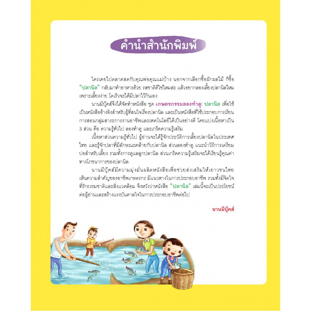 หนังสือที่แนะนำการเลี้ยงปลานิลสำหรับเยาวชน ที่มีสาระความรู้ครอบคลุมครบทุกเรื่อง ตั้งแต่ลักษณะทั่วไปของปลานิลและสายพันธุ์ปลานิลที่เลี้ยงในประเทศไทย แนะนำวิธีเลี้ยงปลานิล เริ่มตั้งแต่การเตรียมพื้นที่ทำบ่อเลี้ยงปลานิล วิธีการดูแลลูกปลานิล เรียนรู้ขั้นตอนการวิดน้ำจับปลานิล รู้จักโรคและศัตรู การนำเนื้อปลานิลมาทำอาหารและแปรรูป พร้อมทั้งเกร็ดน่ารู้ เช่น คุณค่าทางโภชนาการจากเนื้อปลานิล วิธีเลือกซื้อและเก็บรักษาเนื้อปลานิล เน้นการนำเสนอด้วยภาพการ์ตูนน่ารักและภาพจริง