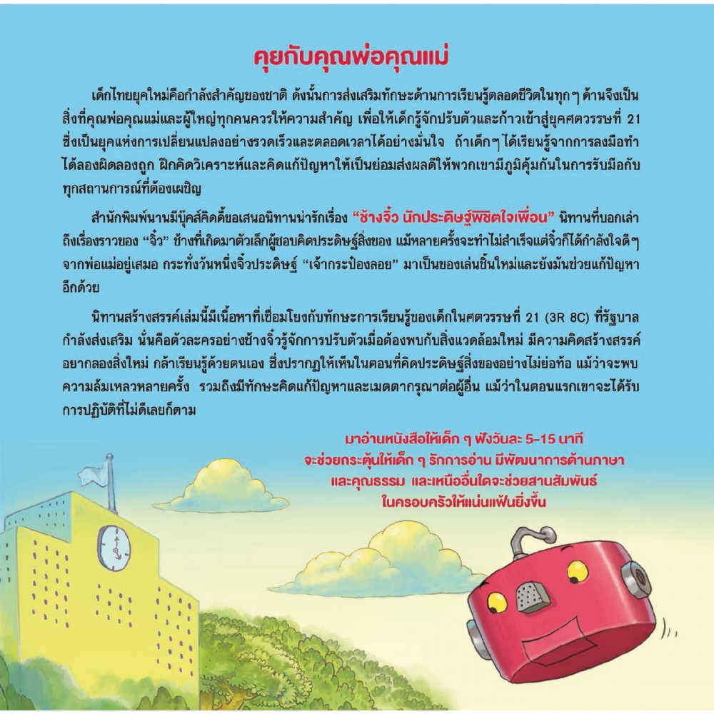 นิทานสร้างสรรค์ที่ชวนให้เด็กฝึกคิดแก้ปัญหาและมีน้ำใจต่อผู้อื่น ช้างจิ๋วไม่มีเพื่อนเล่น ความสุขของจิ๋วคือการได้คิดประดิษฐ์สิ่งของใหม่ ๆ "เจ้ากระป๋องลอย" คือ ของเล่นชิ้นใหม่ที่จิ๋วประดิษฐ์ได้สำเร็จ แต่เพื่อน ๆ กับสงสัยว่า มันพิเศษอย่างไร จิ๋วไปโรงเรียนวันแรกก็ถูกแรดน้อยและผองเพื่อนล้องเลีย แต่จู่ ๆ แรดน้อยก็ถูกเพื่อนที่เกรเรกว่ารังแก งานนี้จิ๋วกับเจ้ากระป๋องลอยจะช่วยเหลืออย่างไรดี ติดตามพร้อมกันในเล่ม