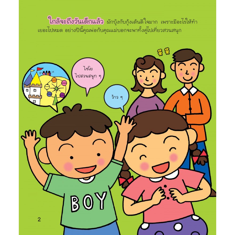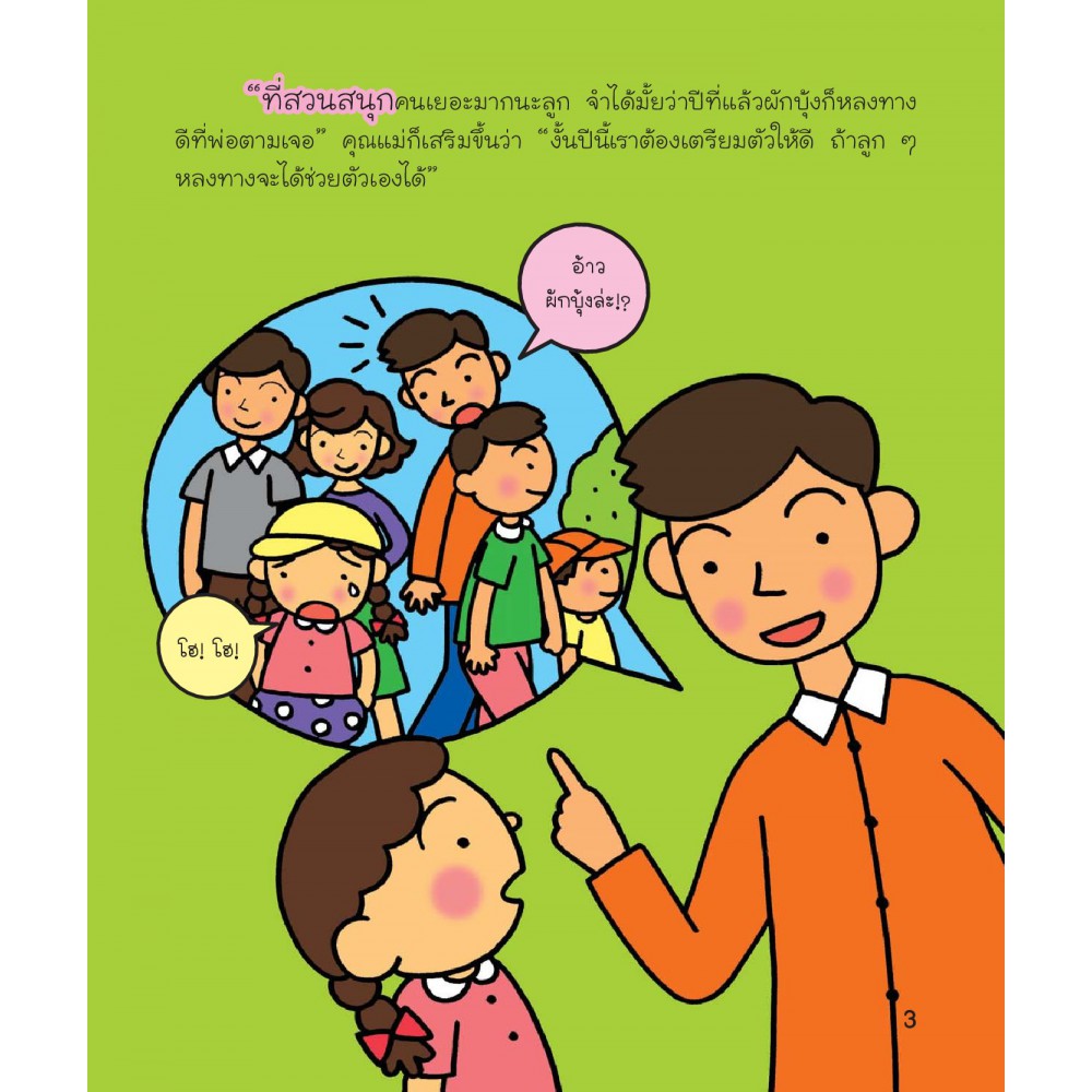 นิทานภาพให้ความรู้เด็กว่าทำยังไงไม่ให้หลงทาง หรือถ้าหลงทางไปแล้วควรปฏิบัติตัวอย่างไร คุณพ่อคุณแม่จะพา "ผักบุ้ง" กับ "กุ้งเต้น" ไปเที่ยวงานวันเด็กที่สวนสนุก แต่ที่นั่นคนเยอะมากๆ แถมปีที่แล้ว "ผักบุ้ง" ก็หลงทาง คุณพ่อคุณแม่เลยต้องสอนเด็กๆ ในการเตรียมตัวให้พร้อม ว่าทำยังถึงจะไม่หลงทาง หรือถ้าหลงทางแล้วต้องทำตัวอย่างไร? ให้ทั้งความเพลิดเพลินและสาระความรู้ไปพร้อมๆ กันเลยทีเดียว