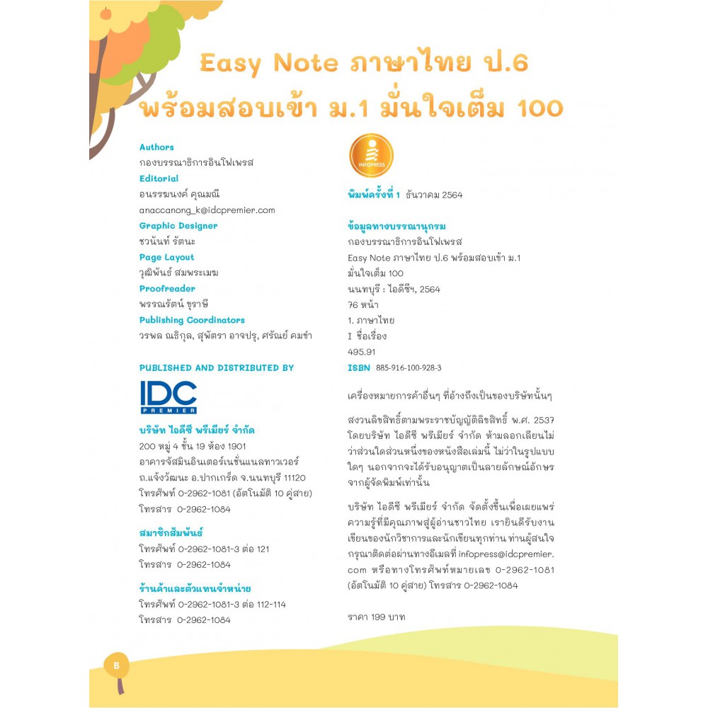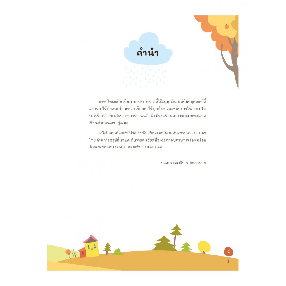 หนังสือเล่มนี้จะทําให้น้องๆนักเรียนหมดกังวลกับการสอบวิชาภาษาไทย ด้วยการสรุปสั้นๆ แต่เก็บรายละเอียดที่จะออกสอบครบทุกเรื่อง พร้อม ตัวอย่างข้อสอบ O-NET, สอบเข้าม.1 และเฉลย