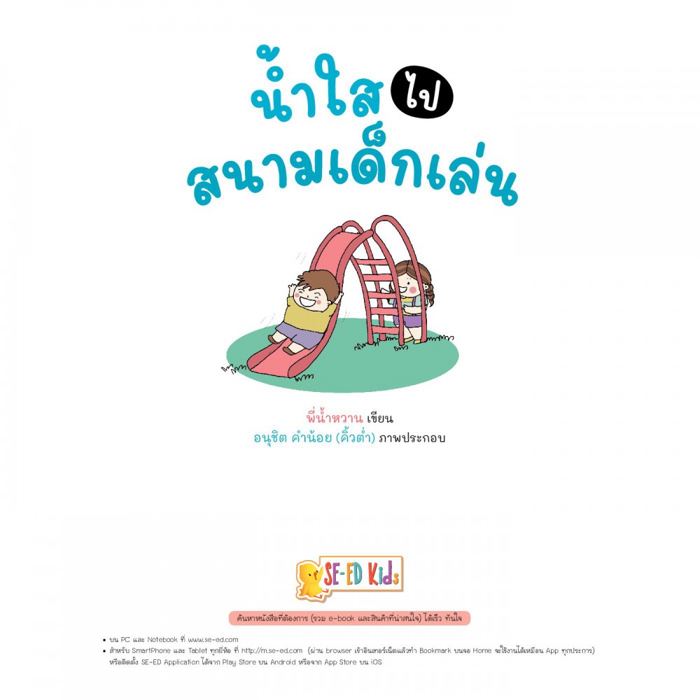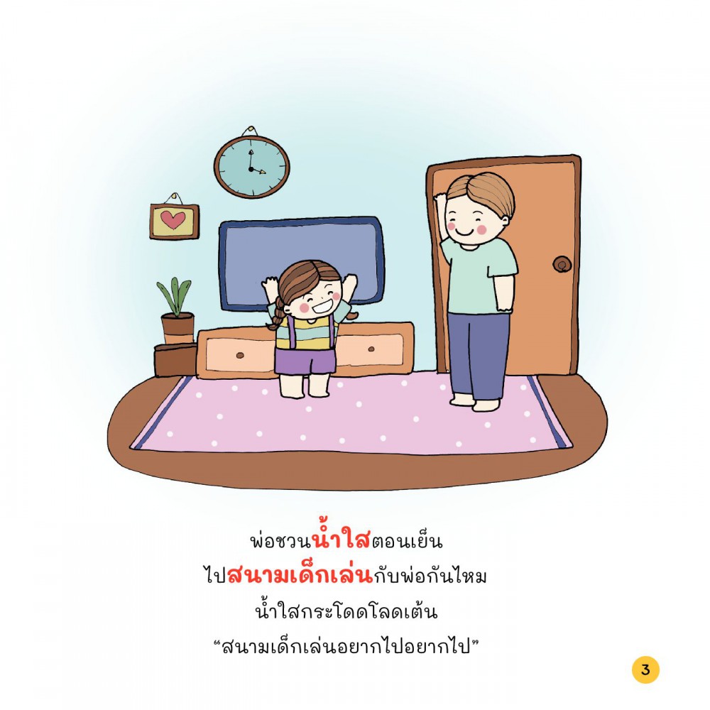 "นิทานภาพที่ใช้คำคล้องจองแสนสนุก เล่าประสบการณ์ในสถานที่ต่าง ๆ ที่เด็กหญิงน้ำใสตัวน้อยได้ไปเป็นครั้งแรก เย็นวันนี้น้ำใสไปสนามเด็กเล่นกับคุณพ่อ ที่นี่มีเพื่อน ๆ วัยเดียวกับน้ำใสเยอะแยะเลย เครื่องเล่นก็มีมากมาย นอกจากได้เล่นสนุกสุด ๆ แล้ว น้ำใสยังได้เพื่อนใหม่หลายคนด้วย “พ่อชวนน้ำใสตอนเย็น ไปสนามเด็กเล่นกับพ่อกันไหม น้ำใสกระโดดโลดเต้น สนามเด็กเล่นอยากไปอยากไป ............................. .......................................... ............................. .......................................... วันนี้น้ำใสแสนสุข ได้เล่นสนุกและมีเพื่อนใหม่ นอนก่อนนะจ๊ะคืนนี้ ได้เล่นเต็มที่จึงหลับสบาย” "