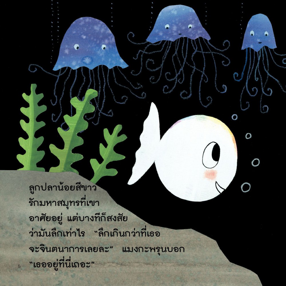 ทะเลลึกเท่าไร เจ้าลูกปลาน้อยสีขาวสงสัย แต่ลูกปลาสีทอง ลูกเต่า และหมึกยักษ์ เพื่อนของเขาต่างเตือนเขาว่าทะเลลึกและอันตรายมาก...แต่ถึงอย่างนั้นลูกปลาน้อยสีขาวก็ยังอยากรู้อยู่ดี