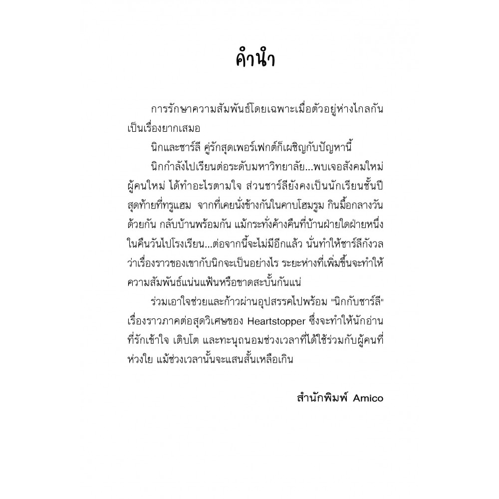 "นวนิยายเรื่องราวต่อจากกราฟิกโนเวล Heartstopper "Nick และ Charlie" เป็นเรื่องราวที่สะท้อนถึงความรัก การเติบโต และการเผชิญหน้ากับการเปลี่ยนแปลงในชีวิตของวัยรุ่นสองคนที่เติบโตมาด้วยกันในโลกที่เต็มไปด้วยความท้าทายและการเรียนรู้ ผ่านความสัมพันธ์ของพวกเขา ผู้อ่านจะได้เดินทางไปพร้อมๆ กับการค้นพบและการยอมรับในความแตกต่างทั้งในตัวเองและคนรอบข้าง เรื่องราวในหนังสือเล่มนี้ไม่เพียงแต่พูดถึงความรักของ Nick และ Charlie เท่านั้น แต่ยังรวมถึงธีมของการเป็นตัวของตัวเอง ความเข้าใจ และการสนับสนุนที่พวกเขาได้รับจากครอบครัวและเพื่อนๆ