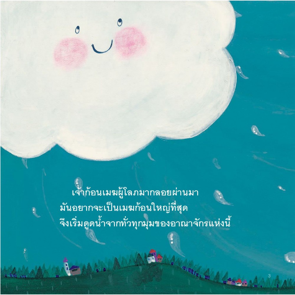 เจ้าก้อนแมฆอยากยิ่งใหญ่บนท้องฟ้า มันจึงดูดน้ำทุกแห่งมาไว้ที่ตัวเอง ทำให้ผู้คนพากันเดือดร้อน เจ้าก้อนเมฆคิดได้ว่าการที่มันตัวใหญ่ทำให้ทั้งอึดอัดและไม่มีความสุขเลย มันจึงกลั่นน้ำฝนลงมาทำให้ตัวมันและทุกคนมีความสุข