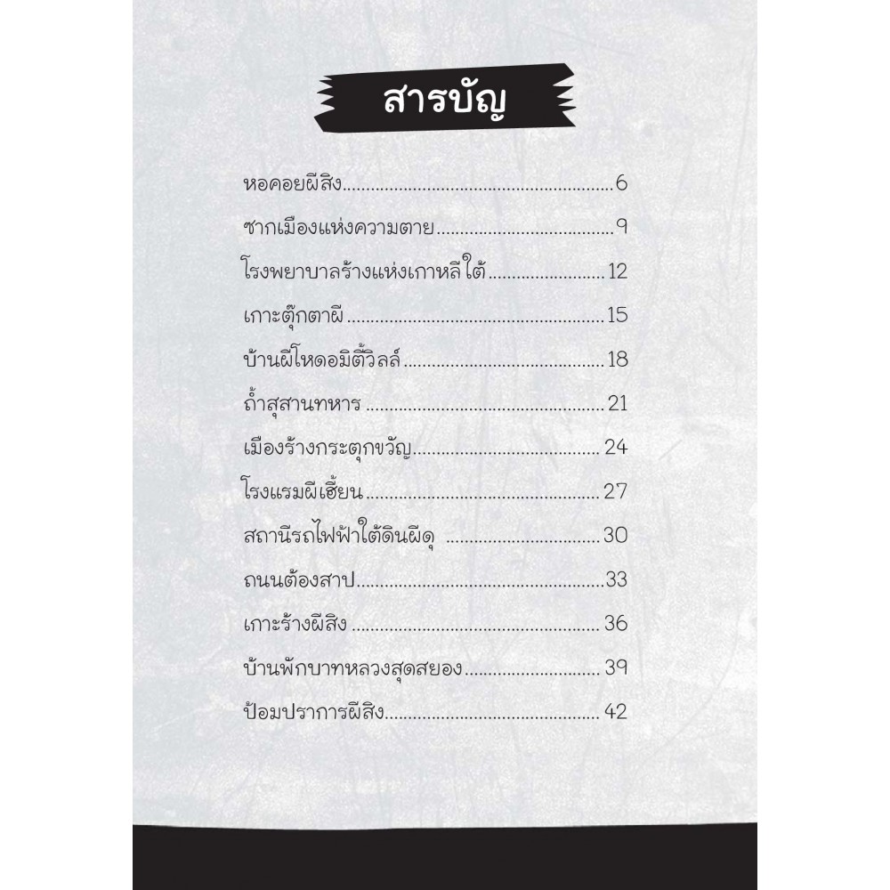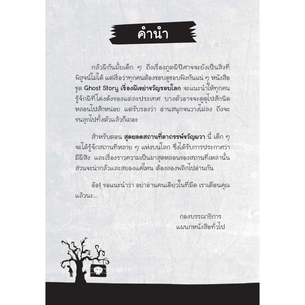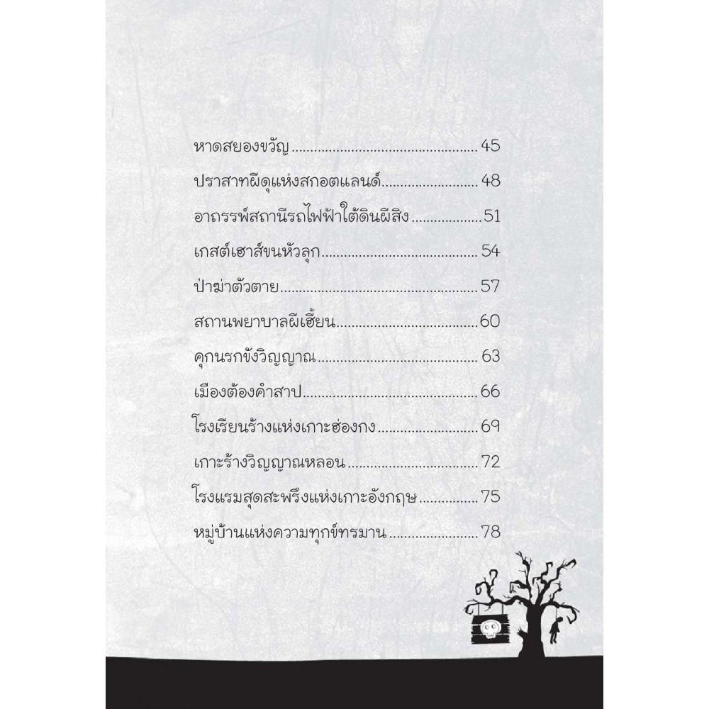 ร่วมขนหัวลุกไปกับซีรีย์ที่รวบรวมเหล่าภูตผีจากตำนานของคนทั่วโลก เล่มนี้พบกับสถานที่หลายๆ แห่งบนโลก ที่ได้รับการยืนยันว่ามีผีสิง รวม 25 เรื่อง เช่น หอคอยผีสิง เกาะตุ๊กตาผี หาดสยองขวัญ เกาะร้างวิญญาณหลอน โรงแรมผีเฮี้ยน และอีกมากมาย พร้อมภาพประกอบขาวดำสวยงาม รับประกันความสยองทั้งเล่ม