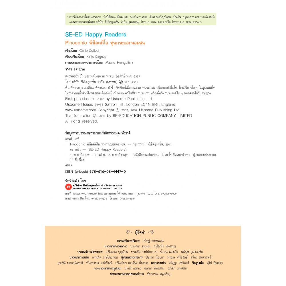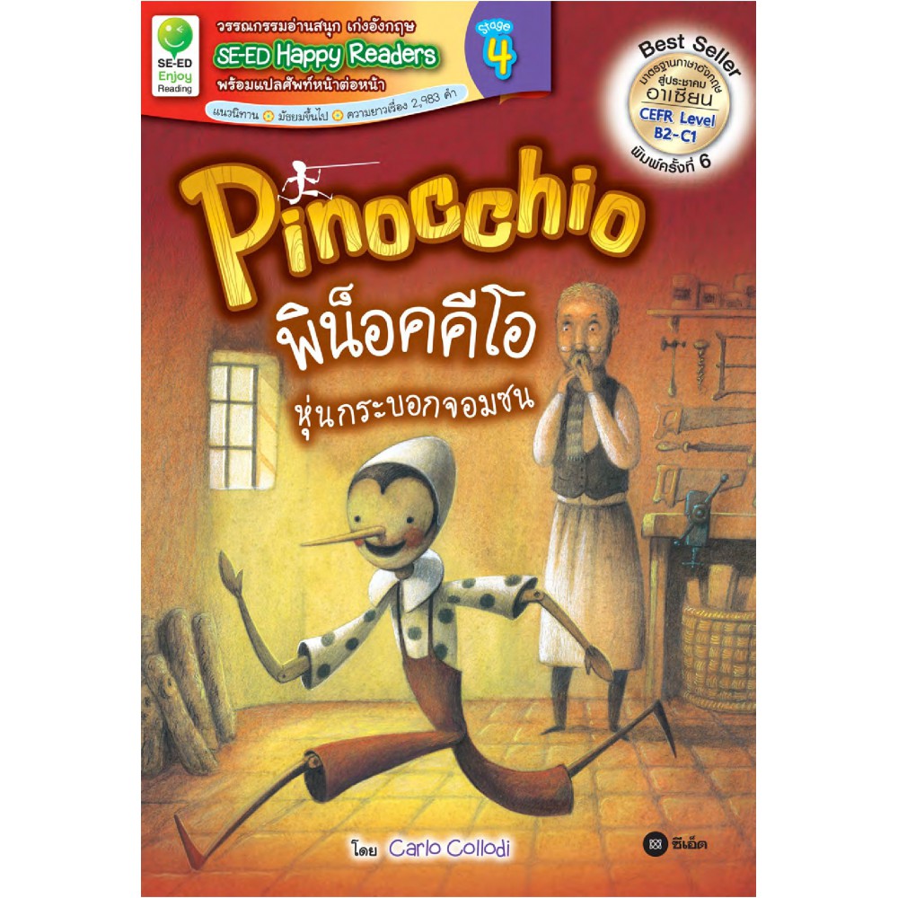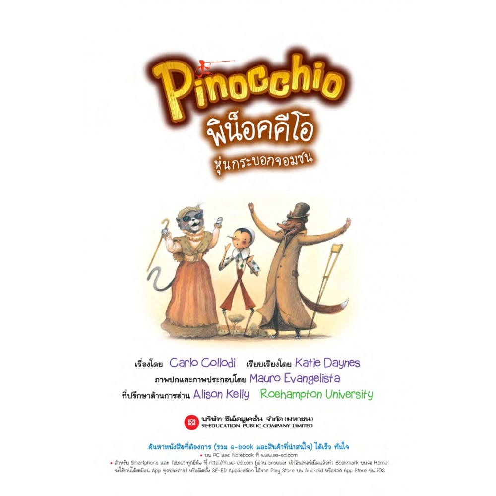 เด็กดีเท่านั้นที่สมควรได้รับพรวิเศษจากนางฟ้า... แต่พิน็อคคีโอเป็นหุ่นกระบอกแสนซน และชอบเที่ยวเล่นเถลไถล จนก่อปัญหาวุ่นวายตามมาตลอด เมื่อใดก็ตามที่พูดโกหก จมูกของพิน็อคคีโอจะยาวขึ้นเรื่อย ๆ แล้วความฝันที่อยากกลายเป็นมนุษย์จะเป็นจริงหรือไม่? พิน็อคคีโอจะทำอย่างไรดีนะ? ติดตามร่วมลุ้นไปกับเรื่องราวของพิน็อคคีโอได้ในเล่ม บทที่ 1 ท่องไม้ท่อนหนึ่ง บทที่ 2 หุ่นกระบอกเจ้าปัญหา บทที่ 3 ไฟไหม้! บทที่ 4 การแสดงหุ่นกระบอก บทที่ 5 สุนัขจิ้งจอกกับแมวเหมียว บทที่ 6 การพบปะกับนางฟ้า บทที่ 7 ทุ่งแห่งปาฏิหาริย์ บทที่ 8 เมืองของเล่น บทที่ 9 ในท้องฉลาม - ศัพท์ สำนวน และวลีจากเนื้อเรื่อง