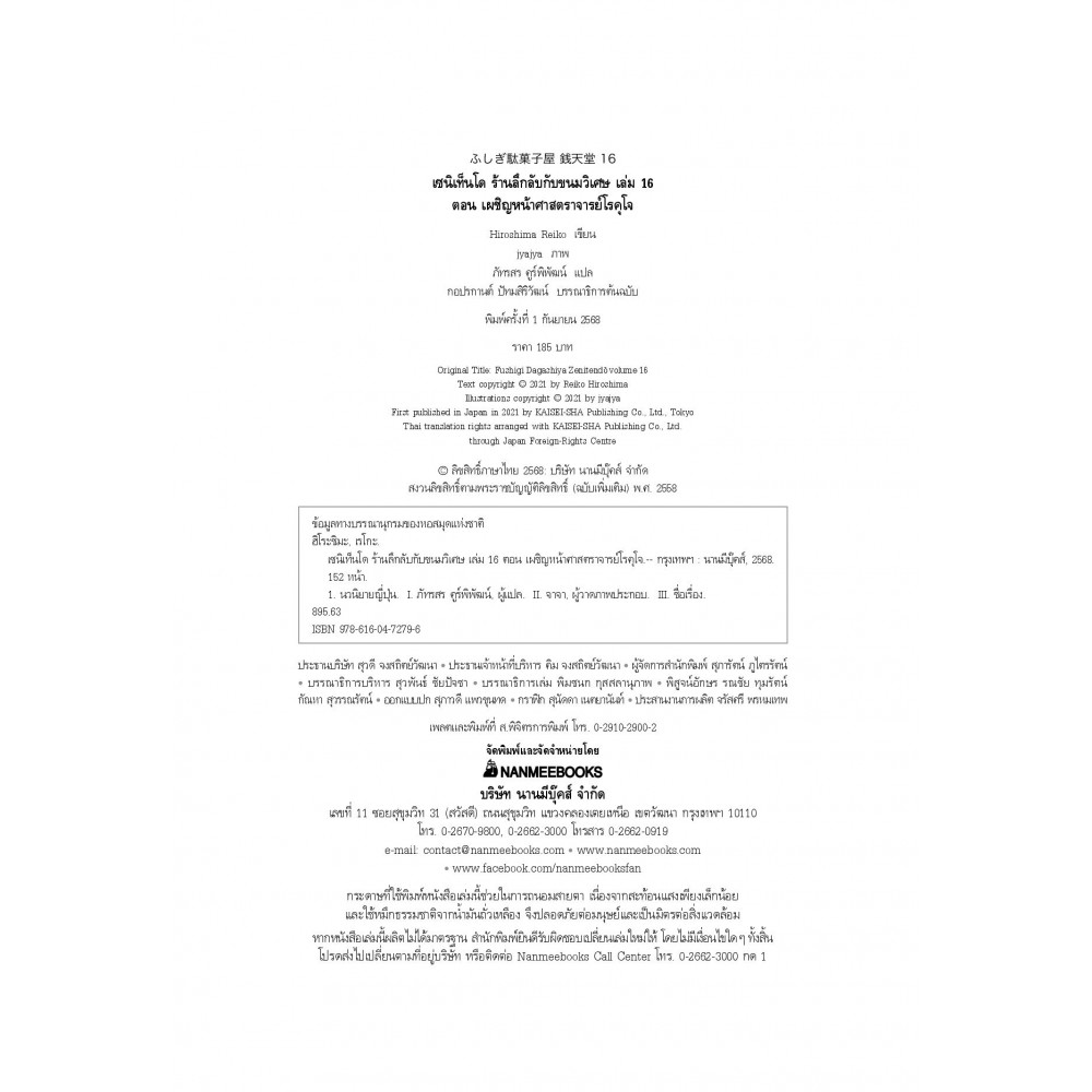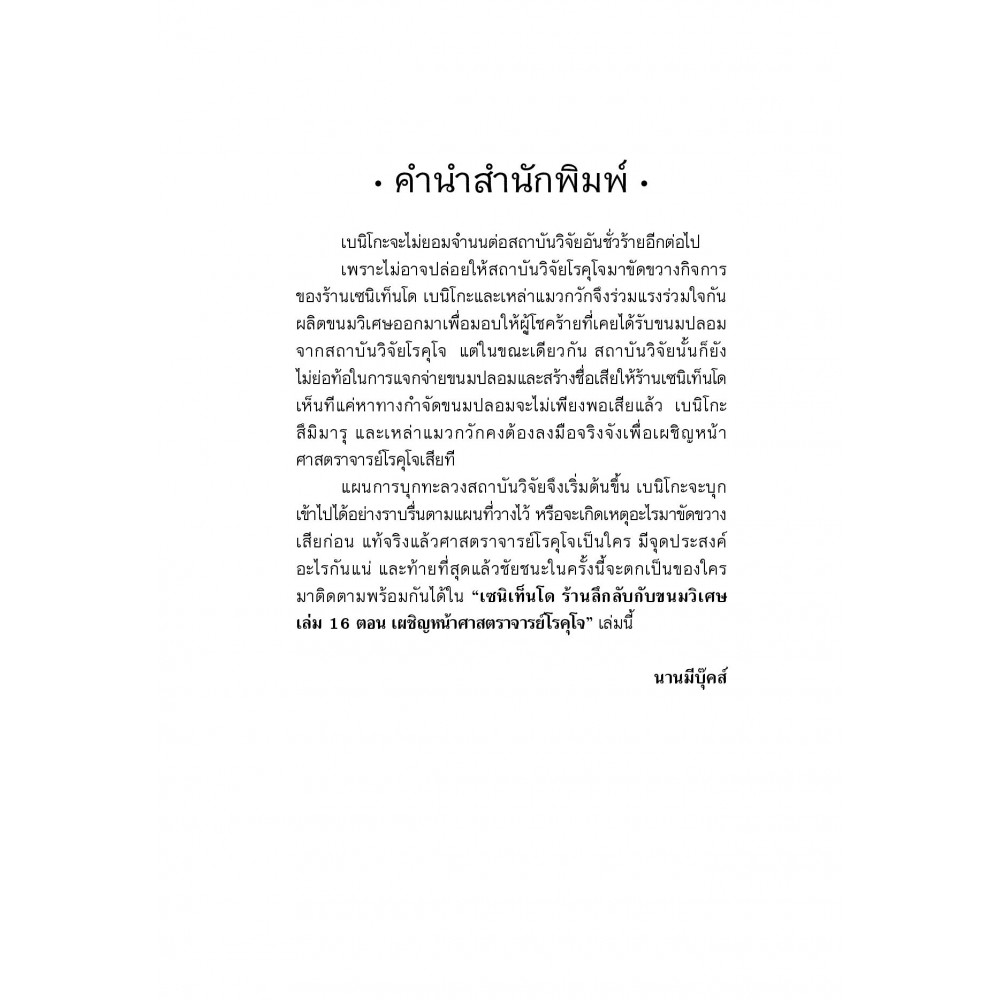 บนิโกะวางแผนกับเหล่าแมวกวักเพื่อตอบโต้สถาบันวิจัยโรคุโจที่บ่อนทำลายร้านเซนิเท็นโดมาตลอด รวมถึงออกไปตามหาคุณลูกค้าผู้ได้รับขนมของปลอมเพื่อช่วยเหลือคนเหล่านั้นจากเคราะห์ร้ายโดยมอบสินค้าที่มีพลังวิเศษให้แทน ไม่ว่าจะเป็น “นักเกตของดี” ซึ่งบันดาลให้ได้รับของดีเลิศกว่าผู้อื่นเสมอ หรือ “ขิงนินจา” ซึ่งช่วยให้มีทักษะอำพรางตัวและปีนป่ายได้ดั่งนินจา สุดท้ายเบนิโกะจะตามหาสถาบันวิจัยโรคุโจเจอหรือไม่ และแผนโต้กลับศาสตราจารย์โรคุโจจะจบลงเช่นไร มาตามลุ้นใน “เชนิเท็นโด ร้านลึกลับกับขนมวิเศษ เล่ม 16 ตอน เผชิญหน้าศาสตราจารย์โรคุโจ” ไปด้วยกัน