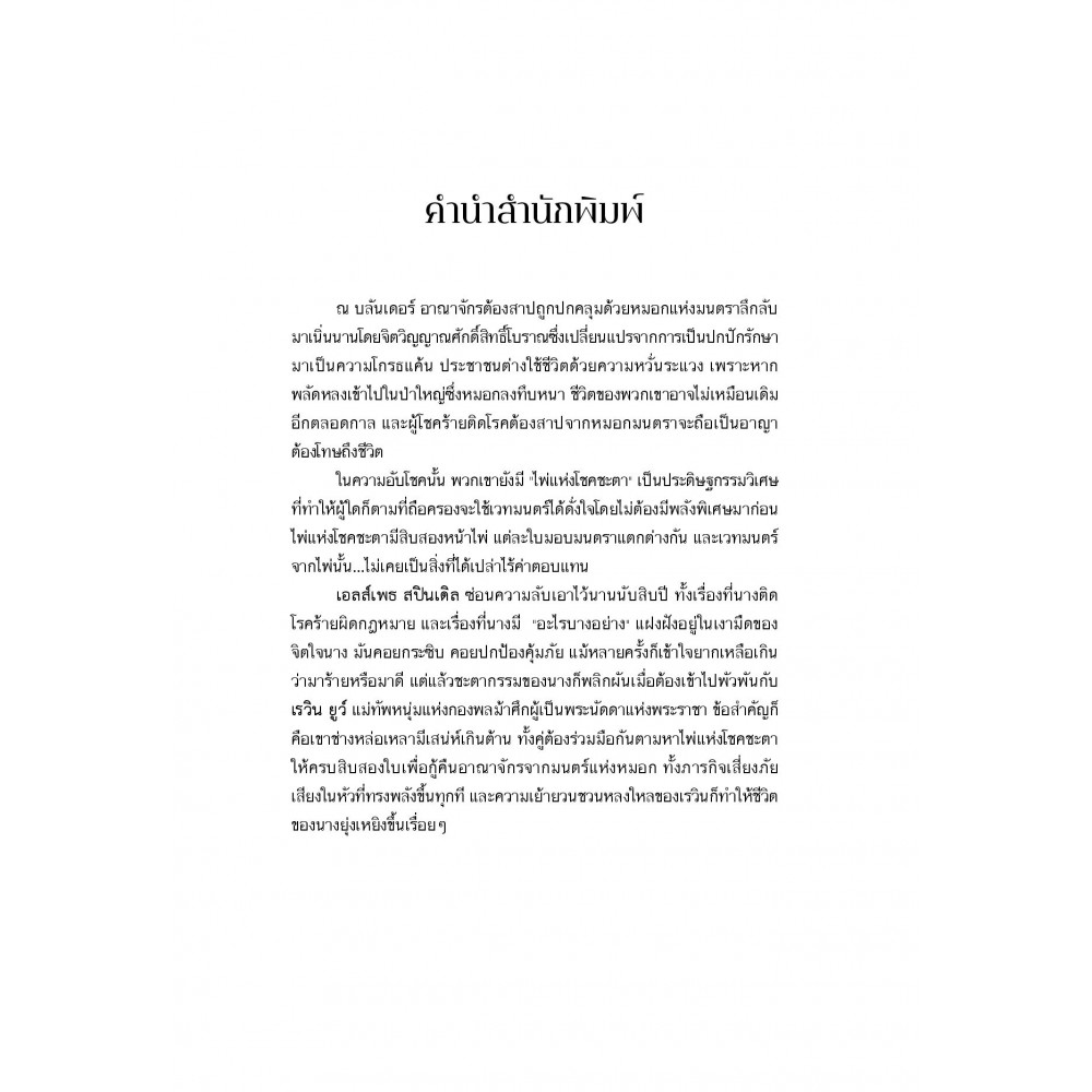 อาณาจักรต้องสาปบลันเดอร์ถูกปกคลุมด้วยหมอกมนตรา หากผู้ใดติดพิษหมอกนี้ เลือดในกายจะกลายเป็นสีดำสนิทและเปลี่ยนเป็นพลังวิเศษ ทว่าพลังมนตราไม่ใช่ของขวัญ ผู้ใดครอบครองเวทมนตร์นี้จะถูกคนของพระราชาตามล่าชีวิต ทางเดียวที่จะคลายคำสาปของหมอกพิษนี้ได้คือต้องรวบรวมไพ่แห่งโชคชะตาให้ครบสิบสองใบ เอลส์เพธ สปินเดิล ซ่อนความลับไว้นานนับสิบปี เธอติดพิษหมอกที่ทำให้สามารถใช้เวทมนตร์ซึ่งเป็นอาญาต่อแผ่นดิน ทั้งยังมี “ฝันร้าย” จิตวิญญาณอันเกรี้ยวกราดลึกลับจากบรรพกาลที่เร้นกายในเงามืดของจิตใจเธอ มันเป็นทั้งผู้ปกป้อง เก็บงำความลับ และคอยครอบงำ แต่เพราะมีมัน เธอจึงอยู่รอดมาได้จนทุกวันนี้ ทว่าชีวิตของเธอถึงคราวพลิกผันเมื่อพบกับ เรวิน ยูว์ แม่ทัพหนุ่มรูปงามผู้เป็นหลานชายของพระราชา ยิ่งผจญภยันตรายร่วมกันเท่าไร แรงดึงดูดระหว่างหัวใจยิ่งรุนแรงเกินต้านขึ้นทุกที ทั้งคู่ต้องช่วยกันรวบรวมไพ่แห่งโชคชะตาให้ครบก่อนวันเหมายัน เพื่อถอนคำสาปแห่งหมอกร้ายและกอบกู้อาณาจักรต้องสาปแห่งนี้ แต่การใช้พลังวิเศษย่อมมีราคาต้องจ่าย หากภารกิจนี้ล้มเหลว ทั้งคู่ย่อมมีโทษฐานกบฏ และยิ่งเธอถลำลึกมากเท่าไร “ฝันร้าย” ยิ่งครอบงำเธอมากขึ้นทุกที…
