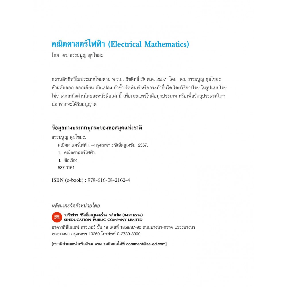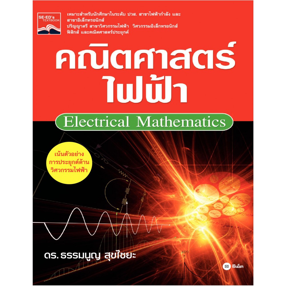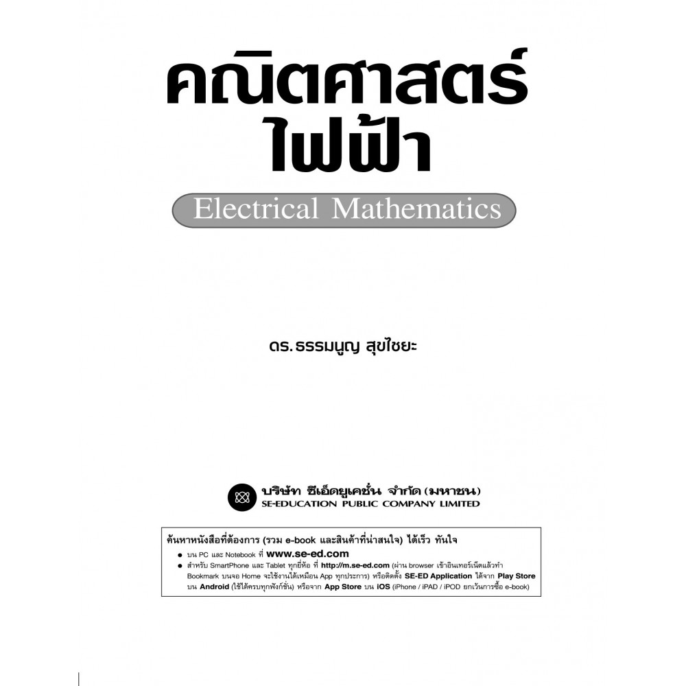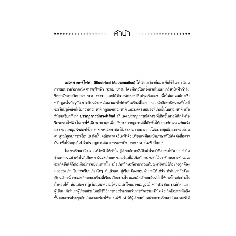 คณิตศาสตร์ไฟฟ้า (Electrical Mathematic) เน้นตัวอย่างการประยุกต์ด้านวิศวกรรมไฟฟ้า ผู้เขียน ดร. ธรรมนูญ สุขไชยะ เรียบเรียงขึ้นมาเพื่อใช้ในการเรียนการสอนรายวิชาคณิตศาสตร์ไฟฟ้า ระดับ ปวส. โดยมีการใช้ครั้งแรกในแผนกวิชาไฟฟ้ากำลัง วิทยาลัยเทคนิคยะลา ปี 2536 และได้มีการพัฒนาปรับปรุงเรื่อยมา เพื่อให้สอดคล้องกับหลักสูตรในปัจจุบัน ในเล่มได้รวบรวมทฤษฎีที่สำคัญในการวิเคราะห์ระบบไฟฟ้า เริ่มตั้งแต่ตัวแปรเชิงซ้อน การวิเคราะห์เวกเตอร์ในระบบ 3 มิติ อนุกรมฟูริเยร์และการแปลงฟูริเยร์ การแปลงลาปลาซและการแปลงลาปลาซผกผัน นอกจากนี้ ยังได้เน้นการนำทฤษฎีของฟูริเยร์และลาปลาซไปประยุกต์ทางด้านวิศวกรรมไฟฟ้าอีกด้วย โดยมีการวิเคราะห์โจทย์ตัวอย่างที่หลากหลายจำนวนมาก เพื่อให้ผู้อ่านได้เกิดแนวคิดในการแก้ปัญหาโจทย์ที่ซับซ้อนอภายใต้สภาวะเงื่อนไขที่แตกต่างกัน อันเป็นประโยชน์อย่างยิ่งต่อการเรียนวิชาคณิตศาสตร์ขั้นสูงต่อไป สารบัญ บทที่ 1 ตัวแปรเชิงซ้อน บทที่ 2 การวิเคราะห์เวกเตอร์ บทที่ 3 อนุกรมฟูริเยร์ บทที่ 4 ผลการแปลงฟูริเยร์ บทที่ 5 การแปลงลาปลาซ บทที่ 6 ผลการแปลงลาปราซผกผัน บทที่ 7 การประยุกต์อนุกรมฟูริเยร์และผลการแปลงฟูลิเยร์ บทที่ 8 การประยุกต์ผลการแปลงฟูลิเยร์