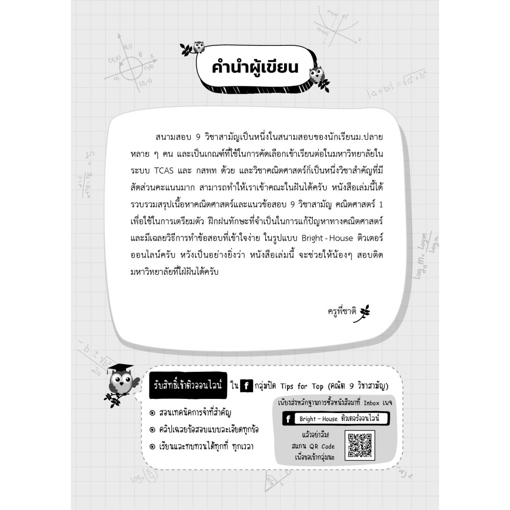 รวบรวมสรุปเนื้อหาและแนวข้อสอบ 9 วิชาสามัญ คณิตศาสตร์ 1 แบบเจาะลึก กระชับ เข้าใจง่าย พร้อมแนวข่อสอบ 2 ชุด ให้น้องๆ ลองทำก่อนลุยสนามจริง เพื่อใช้ในการเตรียมตัว ฝึกฝนทักษะที่จำเป็นในการแก้ปัญหาทางคณิตศาสตร์ และมีเฉลยวิธีการทำข้อสอบที่เข้าใจง่าย ในรูปแบบ Bright-House ติวเตอร์ออนไลน์