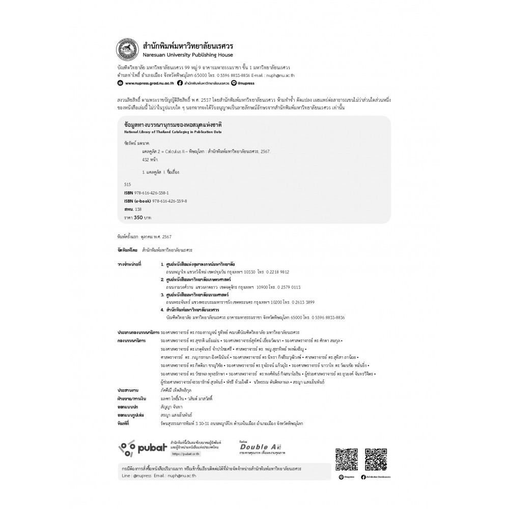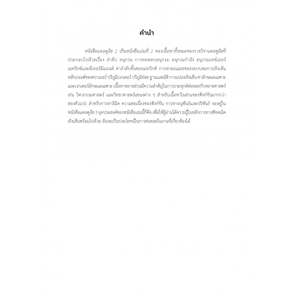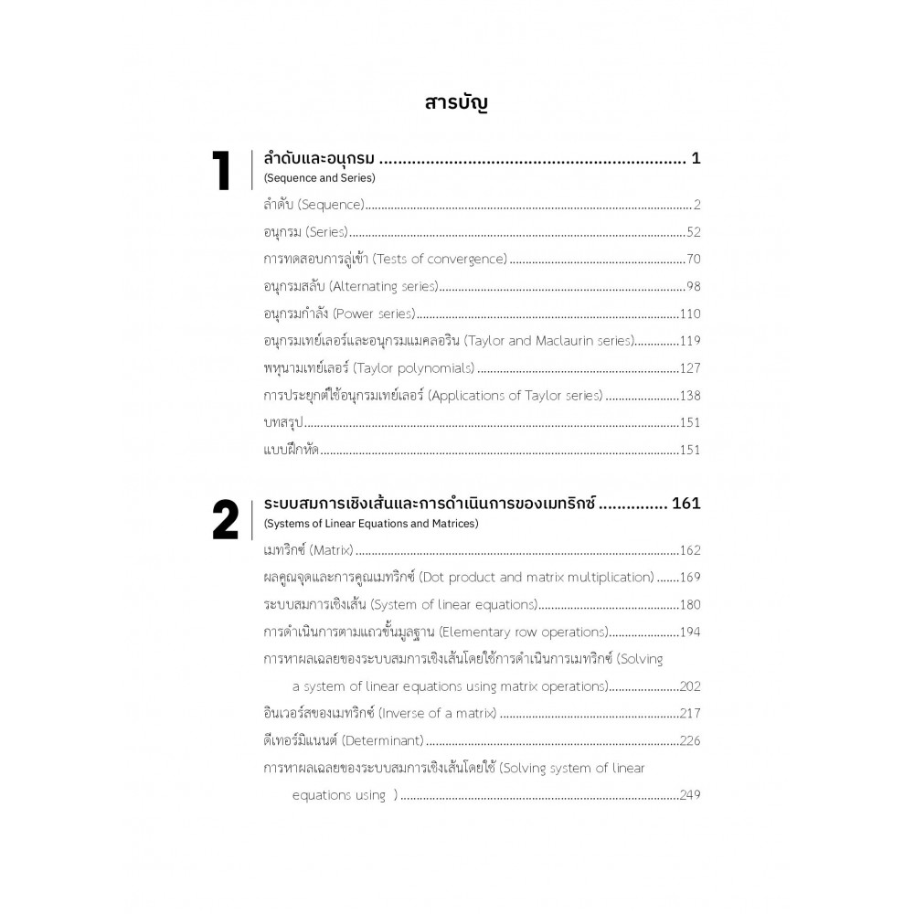 แคลคูลัสโดยทั่วไปแบ่งออกเป็น 3 ส่วนหลัก ได้แก่ แคลคูลัส 1 แคลคูลัส 2 และแคลคูลัส 3 ซึ่งมีเนื้อหาที่ค่อยๆ เพิ่มความซับซ้อนและครอบคลุมแนวคิดที่สำคัญในคณิตศาสตร์ระดับสูง แคลคูลัส 1 (Calculus I) ครอบคลุมพื้นฐานการพิสูจน์ทางคณิตศาสตร์ เช่น การใช้อุปนัยเชิงคณิตศาสตร์ การหาลิมิตและอนุพันธ์ของฟังก์ชัน รวมถึงการประยุกต์ใช้และเทคนิคในการหาปริพันธ์ เนื้อหาในส่วนนี้เป็นรากฐานสำคัญที่นักเรียนควรเข้าใจก่อนจะต่อยอดไปสู่เนื้อหาในระดับสูงกว่า แคลคูลัส 2 (Calculus II) เน้นเพิ่มเติมพีชคณิตเชิงเส้นและความเข้าใจเกี่ยวกับลำดับและอนุกรม มีการตรวจสอบความลู่เข้าของลำดับและอนุกรมโดยใช้เทคนิคต่าง ๆ เช่น การใช้ลิมิต ปริพันธ์ และอัตราส่วน ส่วนสำคัญยังรวมถึงการใช้เมทริกซ์ในการหาผลเฉลยของระบบสมการเชิงเส้น รวมถึงเนื้อหาที่เกี่ยวกับปริภูมิเวกเตอร์ แคลคูลัส 3 (Calculus III) เน้นการหาผลเฉลยของสมการเชิงอนุพันธ์เชิงเส้น การแปลงลาปลาซและลาปลาซผกผัน นอกจากนี้ยังมีเนื้อหาเกี่ยวกับการหาอนุพันธ์และปริพันธ์ของฟังก์ชันหลายตัวแปร รวมถึงแคลคูลัสของเวกเตอร์ เช่น ทฤษฎีบทของเกาส์และสโตกส์ ซึ่งเหมาะสำหรับผู้ที่ต้องการศึกษาในเชิงลึก แต่ละส่วนของแคลคูลัสจะมีบทนิยาม ทฤษฎี และตัวอย่างอย่างละเอียดเพื่อช่วยให้ผู้เรียนสามารถเข้าใจและนำไปประยุกต์ใช้ได้