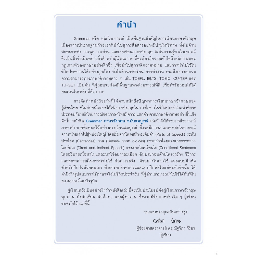 " Grammar หรือ หลักไวยากรณ์ เป็นพื้นฐานสำคัญในการเรียนภาษาอังกฤษเนื่องจากเป็นรากฐานก้าวแรกที่นำไปสู่การสื่อสารอย่างมีประสิทธิภาพ ทั้งในด้านทักษะการฟัง การพูด การอ่าน และการเขียนภาษาอังกฤษ ดังนั้นความรู้ทางไวยากรณ์จึงเป็นสิ่งจำเป็นอย่างยิ่งสำหรับผู้เรียนภาษาที่จะต้องมีความเข้าใจถึงหลักการและกฎเกณฑ์ของภาษาอย่างลึกซึ้ง เพื่อนำไปสู่การตีความหมาย และการนำไปใช้ในชีวิตประจำวันได้อย่างถูกต้อง ทั้งในด้านการเรียน การทำงาน รวมถึงการสอบวัดความสามารถทางภาษาอังกฤษต่าง ๆ เช่น TOEFL, IELTS, TOEIC, CU-TEP และ TU-GET เป็นต้น ที่ผู้สอบจะต้องมีพื้นฐานทางไวยากรณ์ที่ดี เพื่อทำข้อสอบให้ได้คะแนนในระดับที่ต้องการ