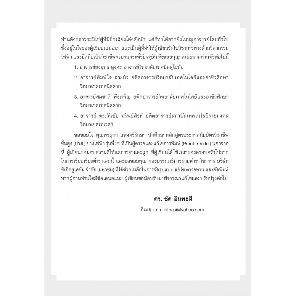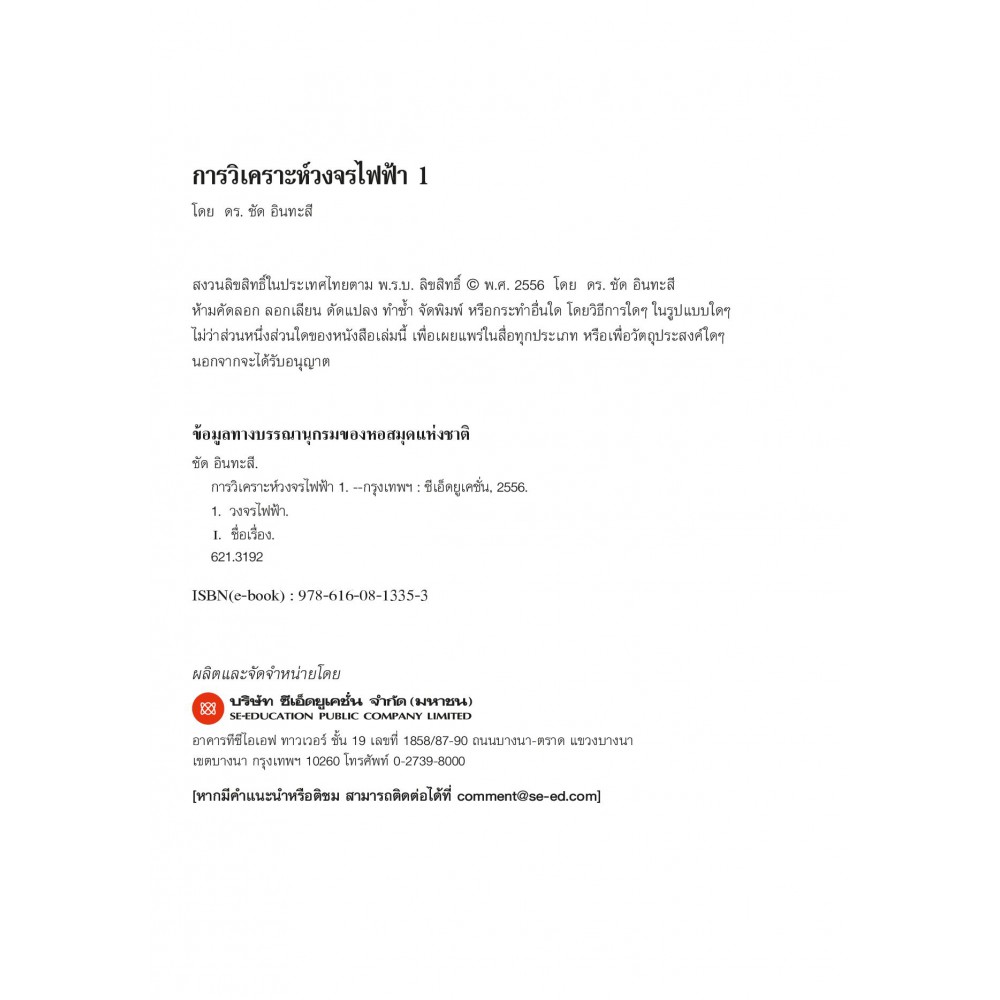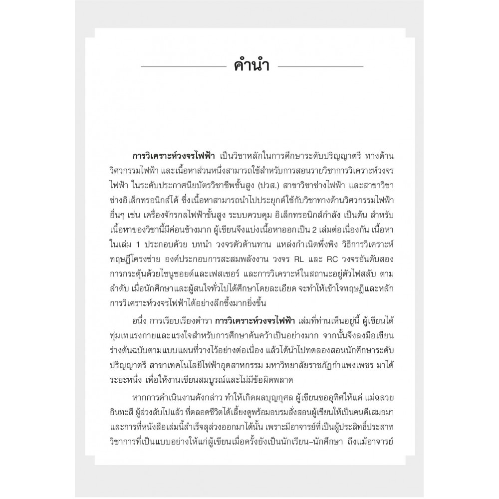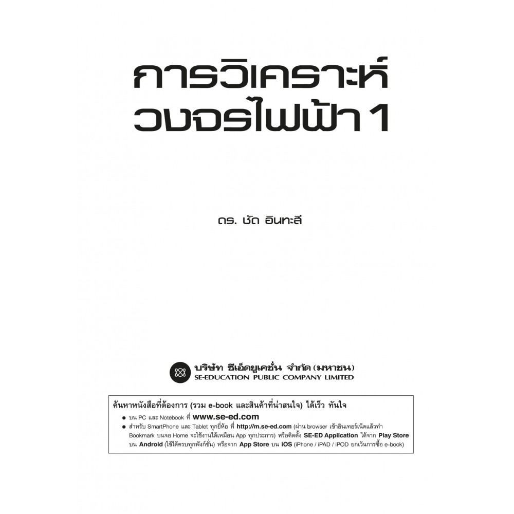 การวิเคราะห์วงจรไฟฟ้า 1 แหล่งกำเนิดพึ่งพิง องค์ประกอบการสะสมพลังงาน วงจรอันดับหนึ่งและวงจรอันดับสอง ไซนูซอยด์และเฟสเซอร์ ผู้เขียน ดร. ชัด อินทะสี ให้เนื้อหาที่สำคัญเกี่ยวกับ "การวิเคราะห์วงจรไฟฟ้า 1" เริ่มตั้งแต่ทำความรู้จักกับวงจรตัวต้านทาน แหล่งกำเนิดพึ่งพิง วิธีการวิเคราะห์ทฤษฎีโครงข่าย องค์ประกอบการสะสมพลังงาน วงจร RL และ RC วงจรอันดับสองการกระตุ้นด้วยไซนูซอยด์และเฟสเซอร์ และการวิเคราะห์ในสถานะอยู่ตัวไฟสลับ ตามลำดับ เมื่อนักศึกษาและผู้สนใจทั่วไปได้ศึกษาโดยละเอียด จะทำให้เข้าทฤษฎีและหลักการวิเคราะห์วงจรไฟฟ้าได้อย่างลึกซึ้งมากยิ่งขึ้น สารบัญ บทที่ 1 บทนำ บทที่ 2 วงจรตัวต้านทาน บทที่ 3 แหล่งกำเนิดพึ่งพิง บทที่ 4 วิธีการวิเคราะห์ทฤษฎีวงจรโครงข่าย บทที่ 5 องค์ประกอบการสะสมพลังงาน บทที่ 6 วงจร RC และ RL บทที่ 7 วงจรอันดับสอง บทที่ 8 การกระตุ้นด้วยไซนูซอยด์และเฟสเซอร์ บทที่ 9 การวิเคราะห์ในสถานะอยู่ตัวไฟสลับ