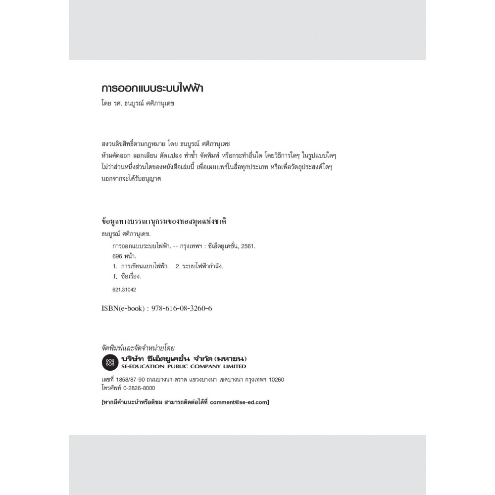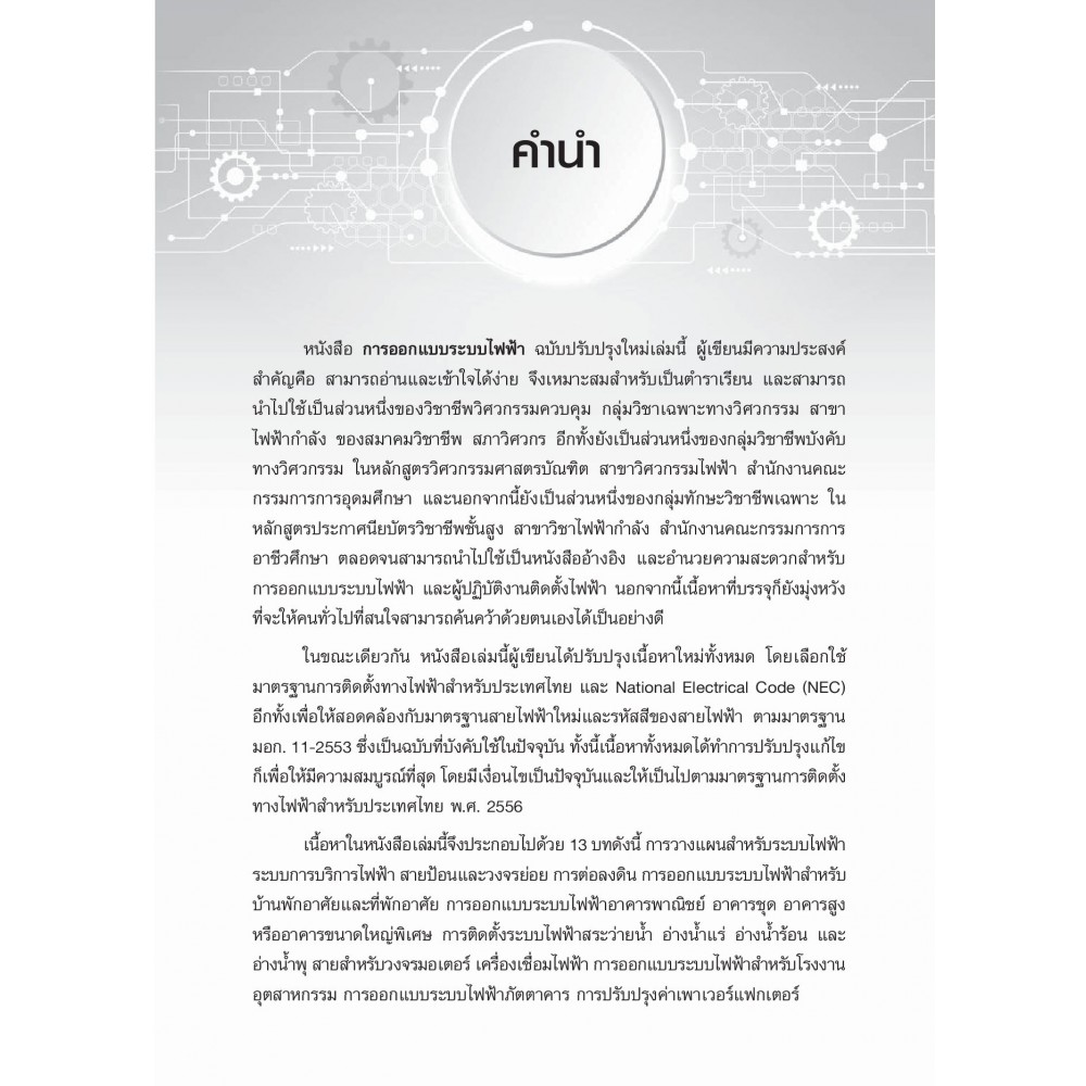 ฉบับปรับปรุงใหม่และมีเนื้อหาเป็นปัจจุบัน โดยผู้เขียนได้เลือกใช้มาตรฐานการติดตั้งทางไฟฟ้าสำหรับประเทศไทยที่ปรับปรุงใหม่ เพื่อให้สอดรับกับมาตรฐานสายไฟฟ้าใหม่ โดยเน้นระบบไฟฟ้าของการออกแบบระบบไฟฟ้าที่พักอาศัย การออกแบบระบบไฟฟ้าอาคารพาณิชย์ การออกแบบระบบไฟฟ้าอาคารชุด การออกแบบระบบไฟฟ้าโรงงานอุตสาหกรรม มอเตอร์ไฟฟ้า เครื่องเชื่อมไฟฟ้า การติดตั้งระบบไฟฟ้า สระว่ายน้ำ อ่างน้ำพุ การต่อลงดิน และการปรับปรุงค่าเพาเวอร์แฟกเตอร์ เหมาะสำหรับใช้เป็นตำราเรียนและนำไปใช้เป็นหนังสือประกอบการปฏิบัติงานจริง