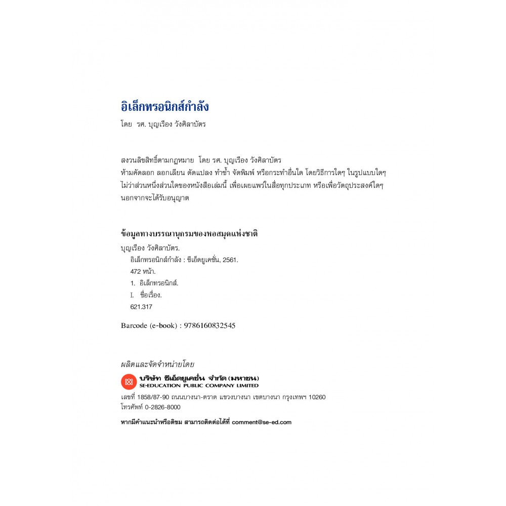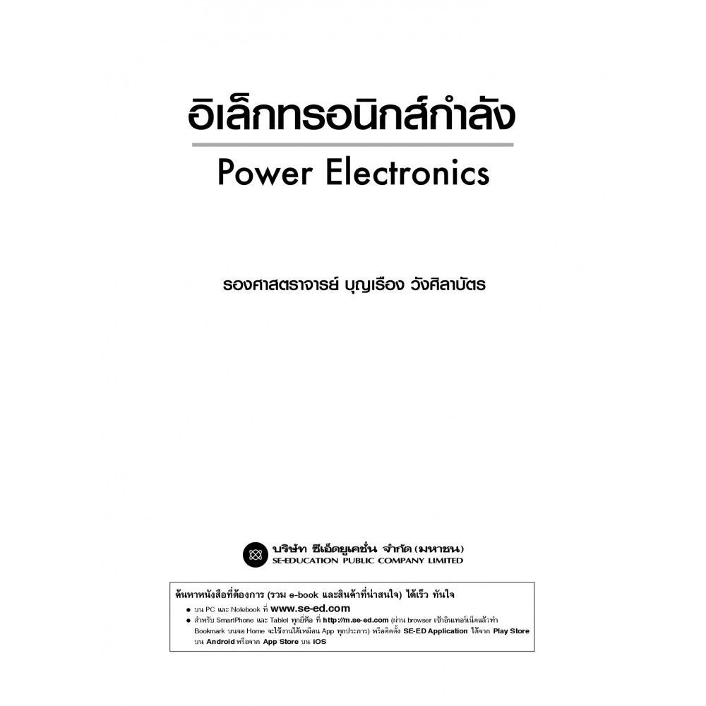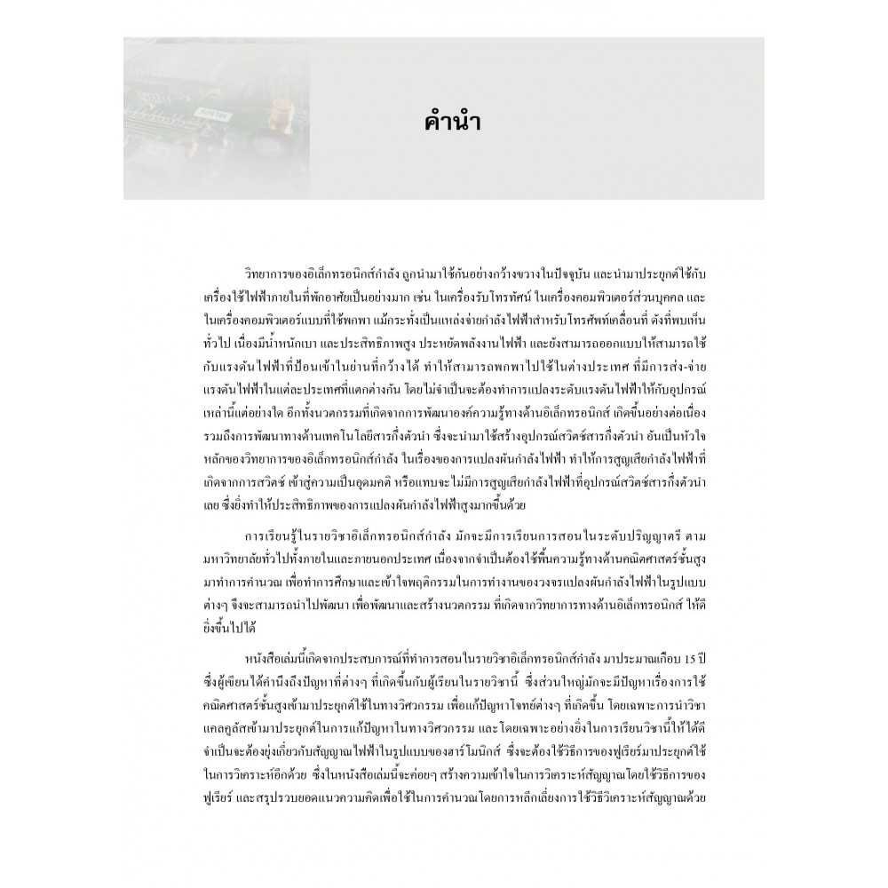 อิเล็กทรอนิกส์กำลัง เหมาะสำหรับนักเรียนและนักศึกษาที่สนใจในเรื่องอิเล็กทรอนิกส์กำลัง และใช้สำหรับเป็นพื้นฐานในการนำไปประกอบการเรียนและการศึกษาในระดับที่สูงขึ้นไป ผู้เขียน รศ. บุญเรือง วังศิลาบัตร รวบรวมและเรียบเรียงจากประสบการณ์ที่ทำการสอนในรายวิชาอิเล็กทรอนิกส์กำลัง ซึ่งพบว่าผู้ศึกษาส่วนใหญ่มักจะมีปัญหาเรื่องการใช้คณิตศาสตร์เข้ามาประยุกต์ใช้ในทางวิศวกรรมเพื่อแก้ปัญหาโจทย์ต่าง ๆ ที่เกิดขึ้น โดยเฉพาะการนำวิชาแคลคูลัสเข้ามาประยุกต์ในการแก้ปัญหาในทางวิศวกรรม เนื้อหาในหนังสือเล่มนี้จึงจะค่อย ๆ สร้างความเข้าใจในการวิเคราะห์สัญญาณโดยใช้วิธีการของฟูเรียร์ และสรุปรวบยอดแนวความคิดเพื่อใช้ในการคำนวณ โดยการหลีกเลี่ยงการใช้วิธีวิเคราะห์สัญญาณด้วยฟูเรียร์อย่างเต็มรูปแบบ เหมาะสำหรับนักเรียนและนักศึกษาที่สนใจในเรื่องอิเล็กทรอนิกส์กำลัง และใช้สำหรับเป็นพื้นฐานในการนำไปประกอบการเรียนและการศึกษาในระดับที่สูงขึ้นไป สารบัญ บทที่ 1 พื้นฐานของอิเล็กทรอนิกส์กำลัง บทที่ 2 อุปกรณ์สารกึ่งตัวนำกำลัง บทที่ 3 วงจรเรียงกระแสไฟฟ้าด้วยไดโอด บทที่ 4 การเรียงกระแสไฟฟ้าที่สามารถควบคุมได้ บทที่ 5 สวิตช์สถิต บทที่ 6 การแปลงผันไฟสลับเป็นไฟสลับ บทที่ 7 การแปลงผันไฟตรงเป็นไฟตรง บทที่ 8 การแปลงผันไฟตรงเป็นไฟสลับหรืออินเวอร์เตอร์ บทที่ 9 การขับนำมอเตอร์ไฟฟ้ากระแสตรง บทที่ 10 การขับนำมอเตอร์ไฟฟ้ากระแสสลับ