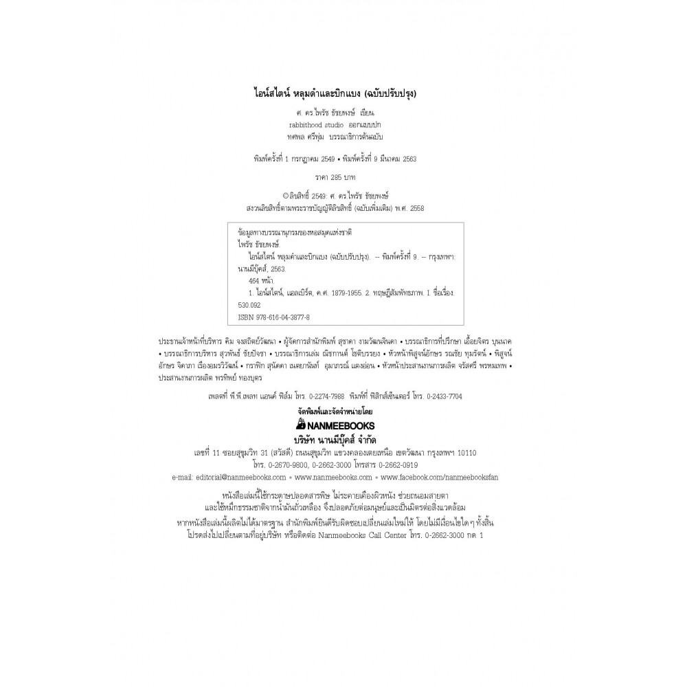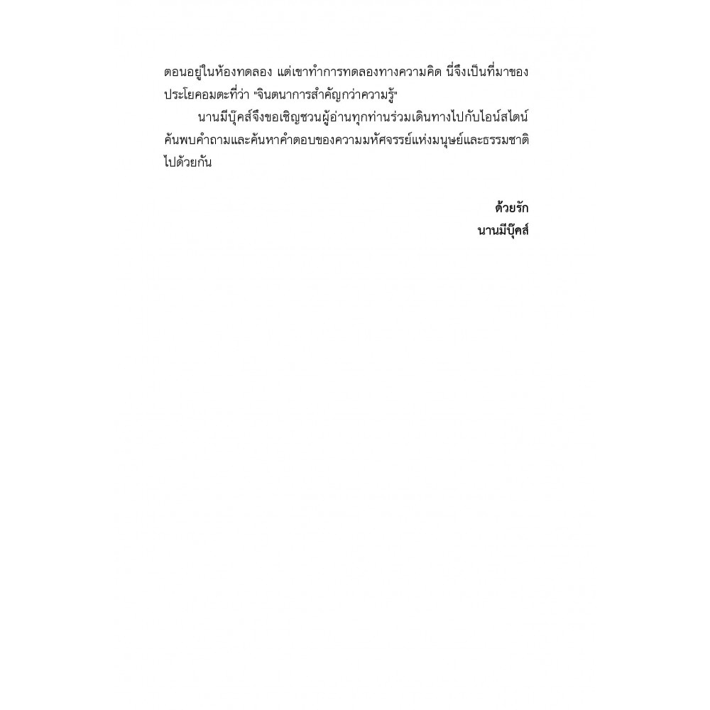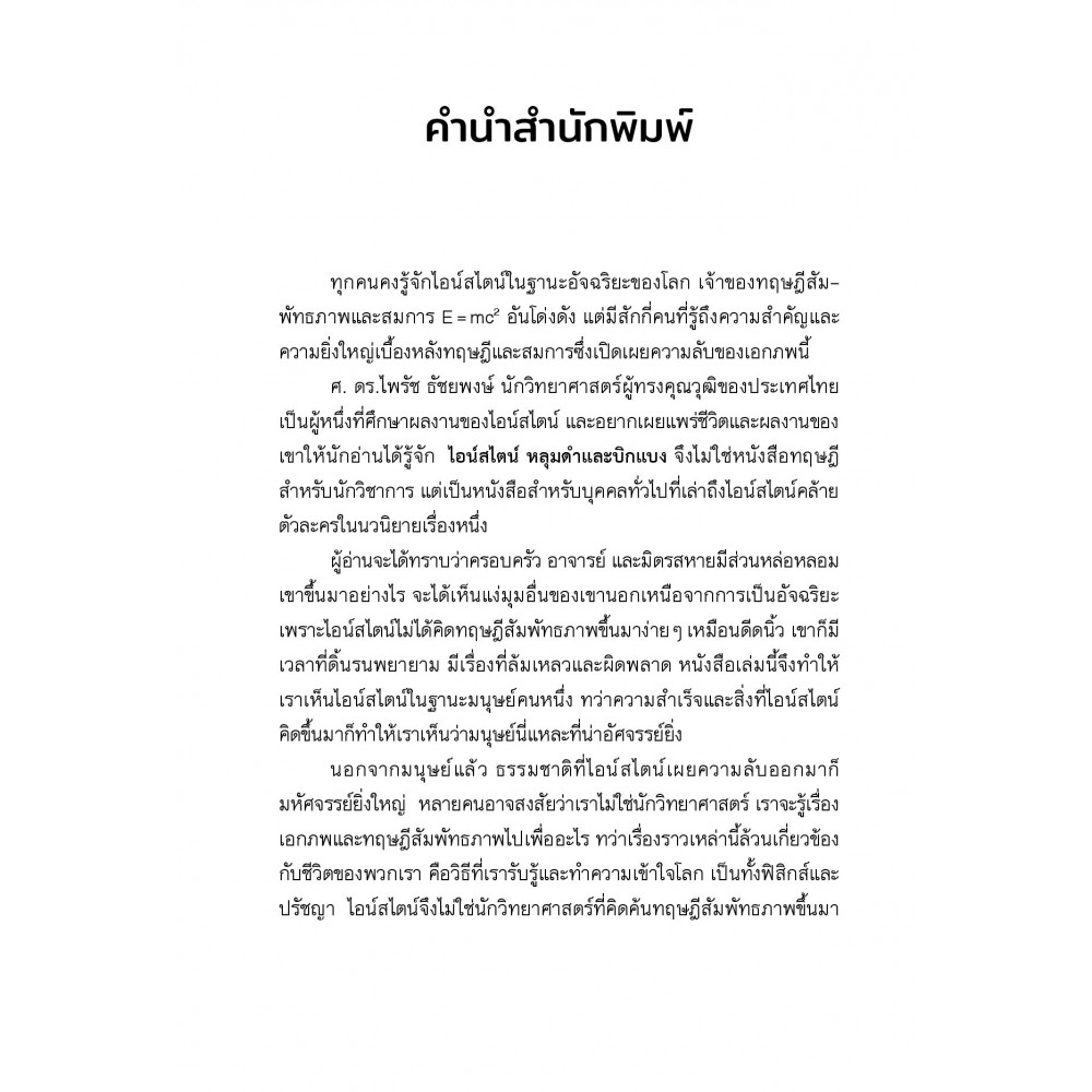 หลายคนคงรู้จักแอลเบิร์ต ไอน์สไตน์ในฐานะอัจฉริยะของโลก เจ้าของทฤษฎีสัมพัทธภาพ และสมการ E = mc2 อันโด่งดัง ไอน์สไตน์ หลุมดำและบิกแบง ไม่ใช่หนังสือทฤษฎีสำหรับนักวิชาการ แต่เป็นหนังสือสำหรับบุคคลทั่วไปที่เล่าถึงไอน์สไตน์คล้ายตัวละครในนวนิยายเรื่องหนึ่ง ผู้อ่านจะได้รู้ว่าครอบครัว อาจารย์ และมิตรสหายมีส่วนหล่อหลอมเขาขึ้นมาอย่างไร จะได้เห็นแง่มุมอื่น ของเขานอกเหนือจากการเป็นอัจฉริยะ หนังสือเล่มนี้ทำให้เราเห็นไอน์สไตน์ในฐานะมนุษย์คนหนึ่ง ทว่าความสำเร็จและสิ่งที่ไอน์สไตน์คิดขึ้นมาก็ทำให้เราเห็นว่ามนุษย์นี่แหละที่น่าอัศจรรย์ เขาไม่ใช่นักวิทยาศาสตร์ที่คิดค้นทฤษฎีสัมพัทธภาพขึ้นมาตอนอยู่ในห้องทดลองเท่านั้น แต่ยังทำการทดลอง ทางความคิดด้วย นี่จึงเป็นที่มาของประโยคอมตะที่ว่า “จินตนาการสำคัญกว่าความรู้”