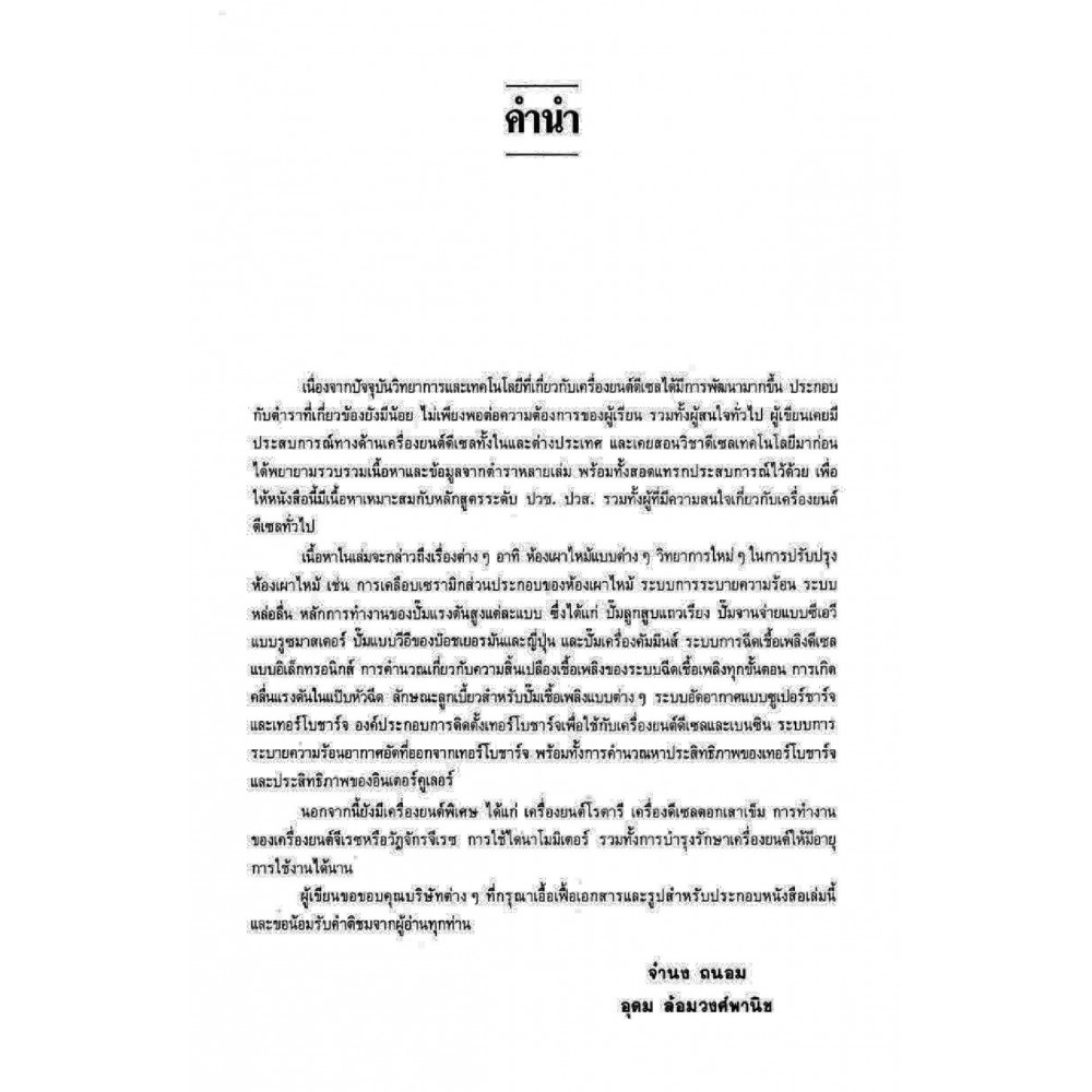 หลักการทำงานของเครื่องยนต์ดีเซล วิทยาการและเทคนิคใหม่ ๆ เช่น การเคลือบส่วนประกอลของห้องเผาไหม้ด้วยเซรามิก ปั๊มแบบใหม่ การฉีดเชื้อเพลิงแบบอิเล็กทรอนิกส์ องค์ประกอบการติดตั้งเทอร์โบซาร์จ และซูเปอร์ชาร์จ นอกจากนี้ยังกล่างถึงเครื่องายนต์พิเศษ ซึ่งได้แก่เครื่องยนต์โรตารี เครื่องดีเซลตอกเสาเข็ม เครื่องยนต์จีเรซ รวมทั่งการบำรุงรักษาเครื่องยนต์ด้วย เนื้อหาภายในเล่มตามหลักสูตรระดับปวช.ปวส.จึงเหมาะสำหรับนักศึกษาและผู้สนใจเครื่องยนต์ดีเซลทั่วไป