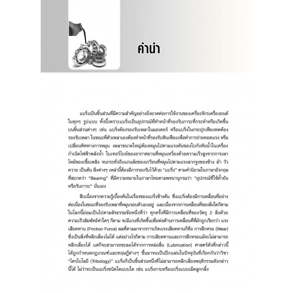 "เทคโนโลยีหล่อลื่นตลับลูกปืนด้วยจาระบี" เล่มนี้ เหมาะสำหรับประกอบการเรียนการสอนนักศึกษาในระดับปริญญาตรี ประกอบด้วยเนื้อหา 11 บท ด้วยกัน ได้แก่ บทนำ การสึกหรอและไตรโบโลยีเบื้องต้น โหมดของการหล่อลื่นแบริ่ง ชนิดของจาระบี การประมาณ (คำนวณ) ค่าอายุขัยของจาระบีที่ใช้หล่อลื่นแบริ่ง ปริมาณจาระบีในการหล่อลื่นแบริ่ง วิธีการในการหล่อลื่นด้วยจาระบี วิธีการทดสอบจาระบี การอ่านสเปกของจาระบี ข้อปฏิบัติในการบำรุงรักษาแบริ่ง และการชำรุดและการวิเคราะห์การชำรุดของแบริ่งที่หล่อลื่นด้วยจาระบี โดยในเล่มได้อธิบายเนื้อหาอย่างละเอียด เป็นลำดับขั้น พร้อมภาพประกอบชัดเจน เข้าใจง่าย