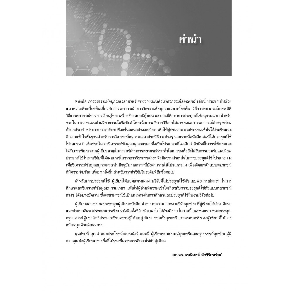 หนังสือ การวิเคราะห์อนุกรมเวลาสำหรับการวางแผนด้านวิศวกรรมโลจิสติกส์ เล่มนี้ ประกอบไปด้วยแนวความคิดเบื้องต้นเกี่ยวกับการพยากรณ์ การวิเคราะห์อนุกรมเวลาเบื้องต้น วิธีการพยากรณ์ทางสถิติ วิธีการพยากรณ์การเรียนรู้ของเครื่องจักรแบบมีผู้สอน และกรณีศึกษาการประยุกต์ใช้อนุกรมเวลาสำหรับช่วยในการวางแผนด้านวิศวกรรมโลจิสติกส์ โดยเน้นการการอธิบายวิธีการได้มาของผลการพยากรณ์ต่างๆ พร้อมทั้งยกตัวอย่างประกอบการอธิบายทีละขั้นตอนอย่างละเอียด เพื่อให้ผู้อ่านสามารถทำความเข้าใจง่ายขึ้นและมีความเข้าใจพื้นฐานสำหรับการวิเคราะห์อนุกรมเวลาด้วยวิธีการต่างๆ นอกจากนี้เนื้อหายังมีการประยุกต์ใช้โปรแกรม R เพื่อช่วยในการวิเคราะห์ข้อมูลอนุกรมเวลา ซึ่งเป็นโปรแกรมที่ไม่เสียค่าลิขสิทธิ์ในการใช้งาน และได้รับการพัฒนาจากผู้เชี่ยวชาญในศาสตร์ด้านการพยากรณ์จากทั่วโลก รวมทั้งยังได้รับการยอมรับและนิยมนำไปประยุกต์ใช้ในงานวิจัยที่ได้เผยแพร่ในวารสารวิชาการต่างๆ เหมาะสำหรับนักศึกษาปริญญาตรี และปริญญาโทคณะวิศวกรรมศาสตร์และคณะบริหารธุรกิจ