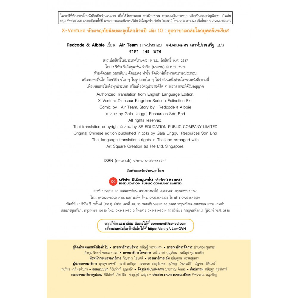ทีมสำรวจ X-Venture ยังติดอยู่ในปลายยุคครีเทเชียส ที่ถือเป็นจุดจบของโลก ไดโนเสาร์สูญพันธุ์เพราะอุกกาบาต แต่ ดร.ดา วินชี กลับหายไป เรน ฌอน และสโตน จึงรีบออกตามหาก่อนที่ทุกอย่างจะสายเกินไป เรนกับเพื่อนๆจะหา ดร.ดา วินชี เจอและหนีออกจากยุคครีเทเชียสได้หรือไม่? ติดตามกันได้ใน "X-Venture นักผจญภัยน้อยตะลุยโลกล้านปี เล่ม 10 : อุกกาบาตถล่มโลกยุคครีเทเชียส" !