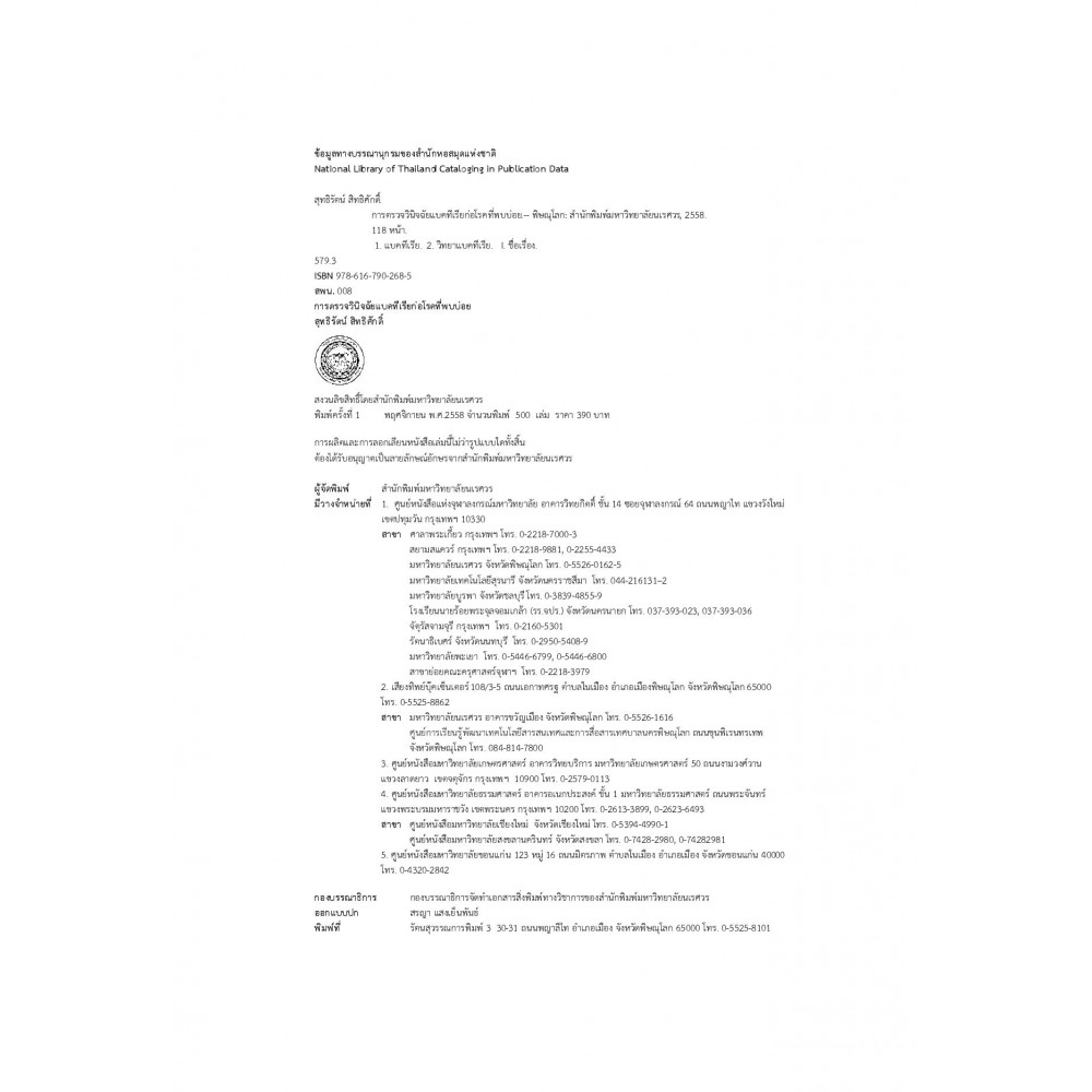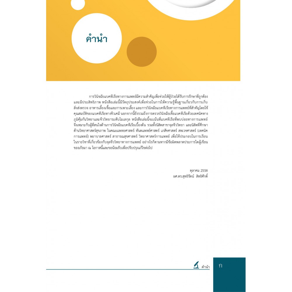 หนังสือเล่มนี้ได้รวบรวมความรู้เกี่ยวกับการเก็บสิ่งส่งตรวจ อาหารเลี้ยงเชื้อ การเพาะเลี้ยง และการวินิจฉัยแบคทีเรียทางการแพทย์ที่สำคัญโดยใช้คุณสมบัติของแบคทีเรียทางชีวเคมี รวมถึงการตรวจวินิจฉัยเชื้อแบคทีเรียโดยวิธีทางภูมิคุ้มกันวิทยาและอณูชีววิทยา โดยเน้นแบคทีเรียที่พบบ่อยทางการแพทย์ หนังสือเล่มนี้จึงเหมาะกับผู้ที่สนใจเพื่อนำความรู้ไปใช้ประโยชน์ในการตรวจวินิจฉัยแบคทีเรียทางการแพทย์