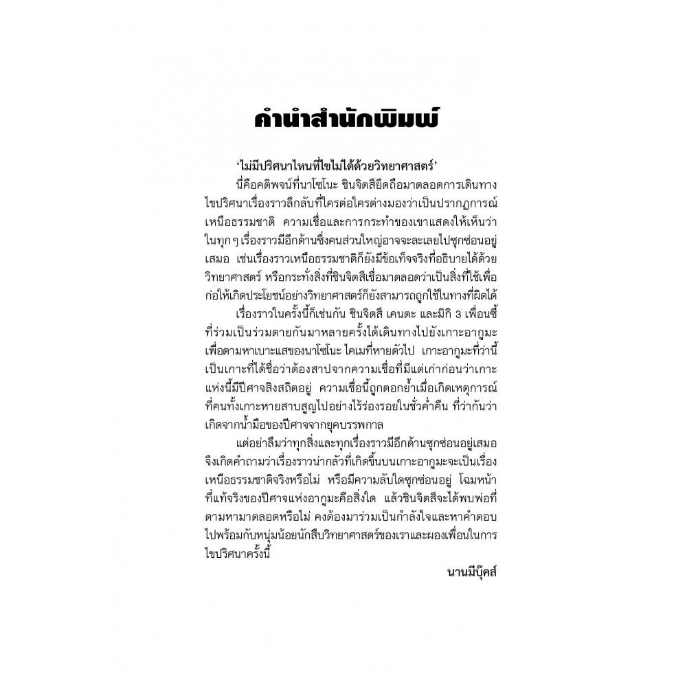 เกาะต้องสาปที่ผู้คนทั้งเกาะหายตัวไปและกลุ่มลัทธิปริศนา พบกับเล่มสุดท้ายของชุด นาโซโนะ มาร่วมไขปริศนาคดีสุดท้ายที่ตัดสินชีวิตของผู้คนกัน! นาโซโนะ ชินจิตสึเดินทางไปที่เกาะอาคูมะ เกาะปริศนาพร้อมกับเคนตะและมิกิ หลังจากได้เบาะแสสำคัญที่บ่งชี้ถึงสถานที่ที่นาโซโนะ ไคเมหายตัวไป ทว่า...เกาะอาคูมะเป็นเกาะที่ได้ชื่อว่า เกาะต้องสาป จากปรากฏการณ์สุดสะพรึงเมื่อผู้คนทั้งเกาะหายตัวไปอย่างไร้ร่องรอยด้วยฝีมือของปีศาจจากยุคบรรพกาล ไหนจะเรื่องราวของกลุ่ม ลัทธิ ปริศนาที่เกี่ยวข้องกับคนใกล้ตัวอย่างไม่น่าเชื่อ ชินจิตสึ เคนตะและมิกิจะไขปริศนาที่จะตัดสินชีวิตของไคเมและผู้คนบนเกาะได้หรือไม่ แล้วตัวตนที่แท้จริงของปีศาจแห่งเกาะอาคูมะจะเป็นสิ่งใดกันแน่ เมืออีกโฉมหน้าหนึ่งของปีศาจร้ายอาจจะซ่อนอยู่ในคราบของเทวดา