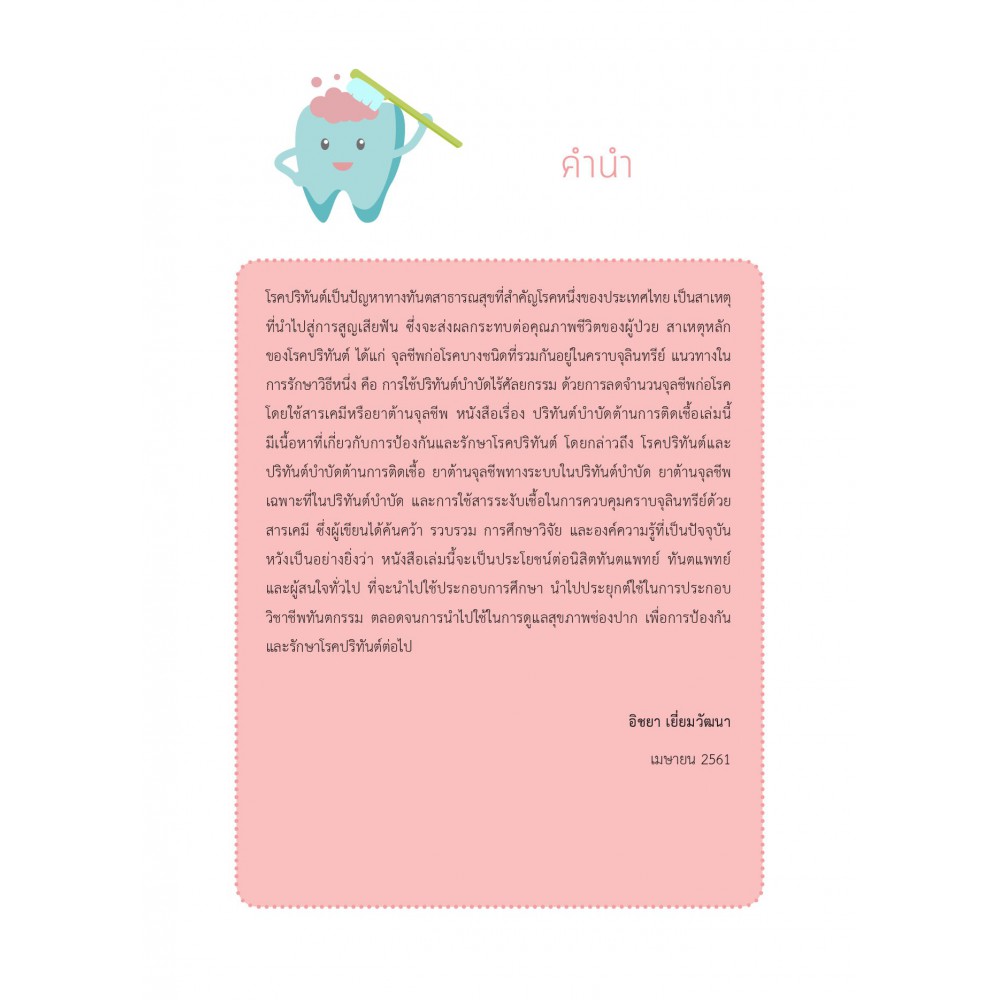 โรคปริทันต์เป็นสาเหตุสำคัญที่นำไปสู่การสูญเสียฟัน ซึ่งจะส่งผลกระทบต่อคุณภาพชีวิตของผู้ป่วย สาเหตุหลักที่ทำให้เกิดโรคปริทันต์ คือ จุลชีพก่อโรค บางชนิดที่รวมกันอยู่ในคราบจุลินทรีย์ แนวทางในการรักษาโรควิธีหนึ่ง คือ ปริทันต์บำบัดไร้ศัลยกรรม โดยการลดจำนวนจุลชีพก่อโรคด้วยการใช้ สารเคมีหรือยาต้านจุลชีพ หนังสือเล่มนี้มีเนื้อหาที่เกี่ยวกับการป้องกันและรักษาโรคปริทันต์ โดยกล่าวถึง โรคปริทันต์ และปริทันต์บำบัดต้านการติดเชื้อ ยาต้านจุลชีพทางระบบในปริทันต์บำบัด ยาต้านจุลชีพเฉพาะที่ในปริทันต์บำบัด ตลอดจนการใช้สารระงับเชื้อในการควบคุมคราบจุลินทรีย์ด้วยสารเคมี หนังสือเล่มนี้เหมาะสำหรับนิสิตทันตแพทย์ ทันตแพทย์ และผู้สนใจทั่วไป ที่จะนำไปใช้ประกอบการศึกษา นำไปประยุกต์ใช้ในการประกอบวิชาชีพทันตกรรม ตลอดจนการดูแลสุขภาพช่องปาก เพื่อการป้องกันและรักษาโรคปริทันต์