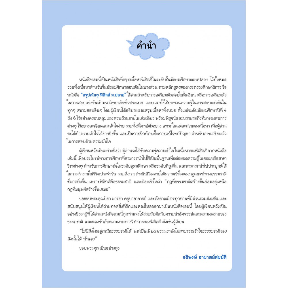 สรุปเนื้อหาฟิสิกส์ในระดับชั้นมัธยมศึกษาตอนปลายไว้ทั้งหมด รวมทั้งเนื้อหาสำหรับชั้นมัธยมศึกษาตอนต้นในบางส่วน ตามหลักสูตรของกระทรวงศึกษาธิการ ใช้สำหรับการเตรียมตัวสอบในชั้นเรียน หรือการเตรียมตัวในการสอบแข่งขันเข้ามหาวิทยาลัยทั่วประเทศ รวมทั้งใช้ทบทวนความรู้ในการสอบแข่งขันในทุกๆ สนามสอบอื่นๆ ในเล่มมีเนื้อหาครอบคลุม ครบถ้วน พร้อมพิสูจน์และบรรยายถึงที่มาของสมการต่างๆ ไว้อย่างละเอียดและเข้าใจง่าย รวมทั้งมีโจทย์ตัวอย่าง แทรกในแต่ละส่วนของเนื้อหา เพื่อผู้อ่านจะได้ทำความเข้าใจได้ง่ายยิ่งขึ้น