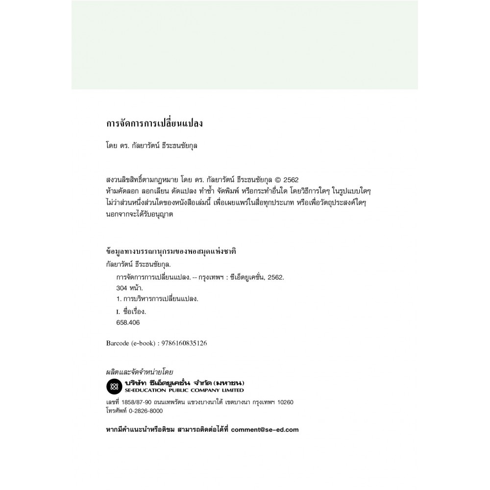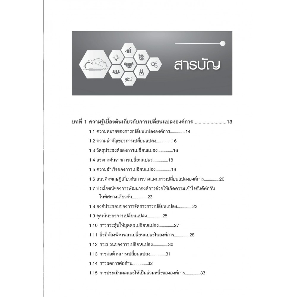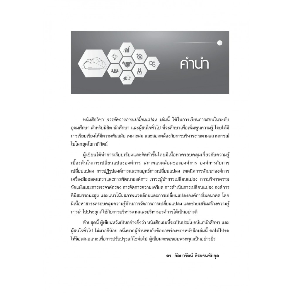 การจัดการการเปลี่ยนแปลง เล่มนี้ เหมาะสำหรับประกอบการเรียนการสอนในระดับอุดมศึกษา และผู้สนใจทั่วไปที่ต้องการศึกษาเพิ่มพูนความรู้ โดยได้มีการเรียนเรียงให้มีความทันสมัย เหมาะสมและสอดคล้องกับการบริหารงานในยุคโลกาภิวัตน์ มีเนื้อหาครอบคลุมความรู้เบื้องต้นเกี่ยวกับการเปลี่ยนแปลงองค์การ สภาพแวดล้อมขององค์การ องค์การกับการเปลี่ยนแปลง การปฏิรูปองค์การและกลยุทธ์การเปลี่ยนแปลง เทคนิคการพัฒนาองค์การ เครื่องมือสอดแทรกและการพัฒนาองค์การ ภาวะผู้นำการเปลี่ยนแปลง การบริหารความขัดแย้งและการเจรจาต่อรอง การจัดการความเครียด การดำเนินการเปลี่ยนแปลง องค์การที่มีสมรรถนะสูง และแนวโน้มสภาพแวดล้อมและการเปลี่ยนแปลงองค์การในอนาคต นอกจากนี้ยังครอบคลุมความรู้ด้านการจัดการการเปลี่ยนแปลง และช่วยเสริมสร้างความรู้ รวมทั้งการนำไปประยุกต์ใช้กับการบริหารงานและบริหารองค์การได้เป็นอย่างดี