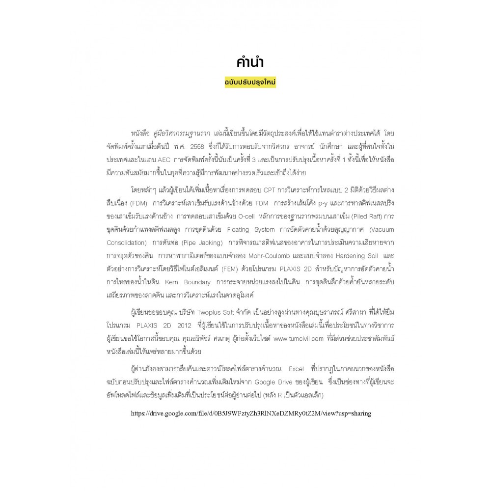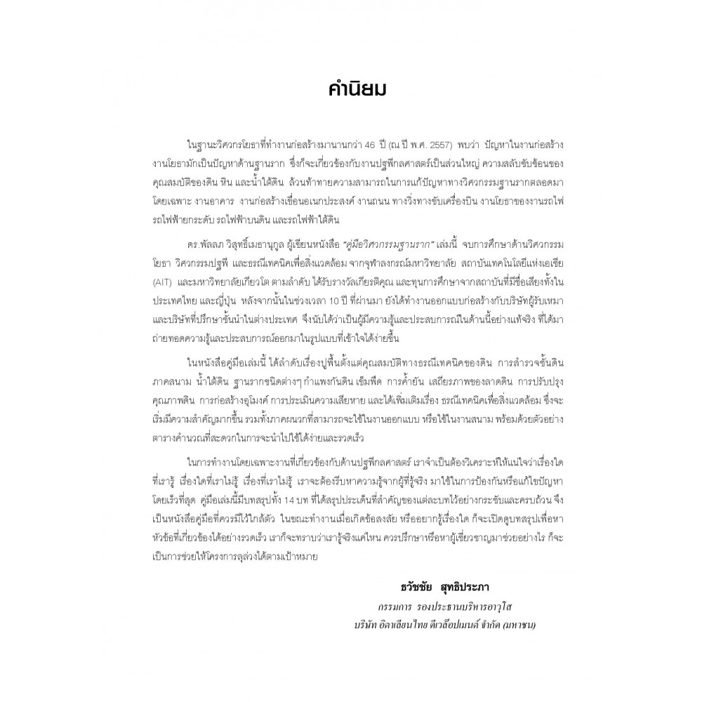"คู่มือวิศวกรรมฐานราก" เล่มนี้ เขียนขึ้นโดยมีวัตถุประสงค์เพื่อให้ใช้แทนตำราต่างประเทศได้โดยจัดพิมพ์ครั้งแรกเมื่อต้นปี พ.ศ. 2558 ซึ่งก็ได้รับการตอบรับจากวิศวกร อาจารย์ นักศึกษา และผู้ที่สนใจทั้งในประเทศและในแถบ AEC การปรับปรุงเนื้อหาครั้งนี้เพื่อให้หนังสือมีความทันสมัยมากขึ้น ในยุคที่ความรู้มีการพัฒนาอย่างรวดเร็วและเข้าถึงได้ง่าย